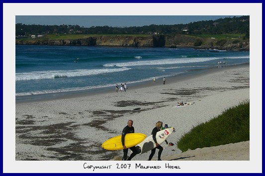 Am Carmel Beach war nicht viel los. Ein paar Surfer, zwei Sonnenanbeter und ein Hund,