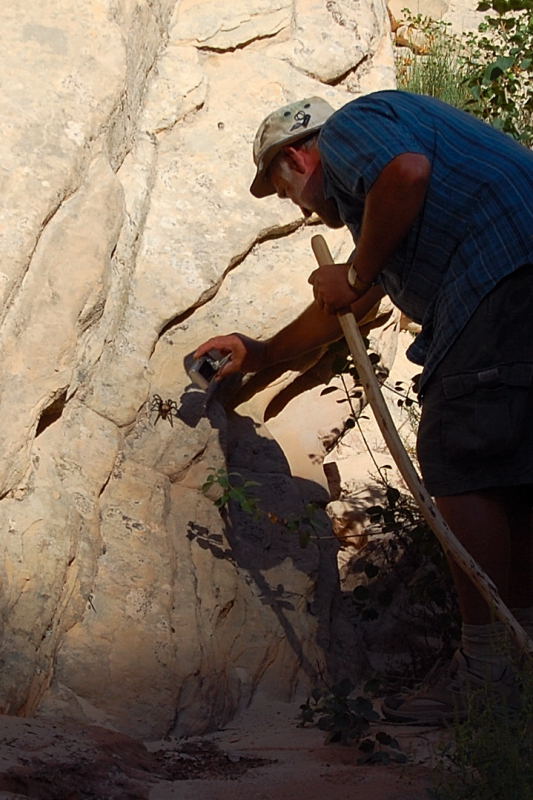Endlich kommt auch mein Stockschnitzer angelatscht und ich kann ihm meine Entdeckung zeigen. Die Tarantel krabbelt ein wenig hier und ein wenig da an der Canyonwand entlang, sie findet scheinbar keinen guten Ort um sich vor uns zu verstecken und so hat auch Herbert ausgiebig Gelegenheit sie zu fotografieren und aufzunehmen. Dann ist auch er Tarantelsatt und wir ziehen weiter, die Fotos von der toten können wir jetzt löschen, schließlich ist ein lebendiges Exemplar viel interessanter.