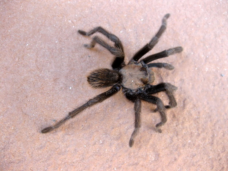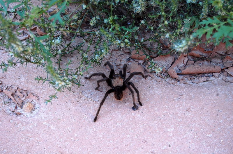 Kurz darauf, ich bin schon wieder mal einen halben Kilometer voraus, sehe ich etwas relativ Großes, Schwarzes im Sand am Canyonrand krabbeln. Na nichts wie hin, diesmal ist es eine lebendige Tarantel von ungefähr 8 cm Durchmesser. Ich habe keine Angst vor dem netten Tierchen und gehe sofort mit der Nikon auf sie los. Dann packe ich schnell noch die kleine Canon Ixus aus um das Tierchen zu filmen, denn Herbert ist ja noch hoffnungslos weit hinter mir.