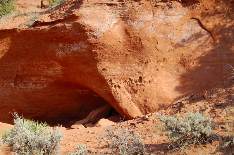 Dann zieht sich der Trail und es gibt ein paar witzige Umwege, welche nichts bringen, nerv. Der Trail ist nicht anstrengend und hat kaum Höhenunterschiede, einmal komme ich an einer kleinen Höhle vorbei, an deren Außenwänden lauter Handabdrücke in den Sandstein eingraviert sind. Im ersten Augenblick sieht es fast archaisch aus, doch ich glaube das ist Felsmalerei neueren Datums. Ich knipse es trotzdem.