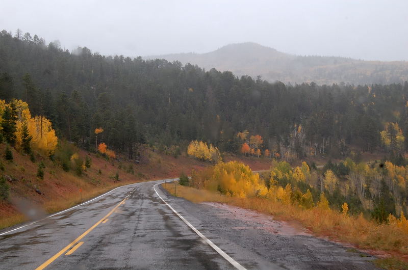 Am Kiva Coffee House legten wir einen Stop ein. Mit diesem Stop gaben wir den Regenwolken Gelegenheit uns einzuholen und von nun an durften wir mit betätigten Scheibenwischern durch diese Traumlandschaft fahren. Nachdem wir Boulder hinter uns gelassen hatten ging es Richtung Torrey und diese Strecke waren wir 2008 ja auch schon mal gefahren. Damals war das Wetter aber um einiges besser als diesmal, je höher wir in die Berge des Dixi National Forest kamen umso nebliger wurde es. Die Straße geht bis auf 3.000 Meter hoch und auch hier war schon eine herrliche, herbstliche Blätterfärbung, wenn man denn etwas davon sehen konnte.