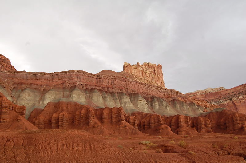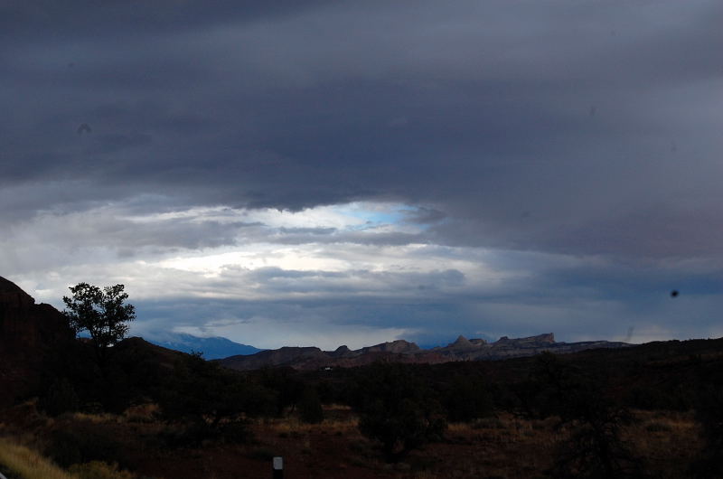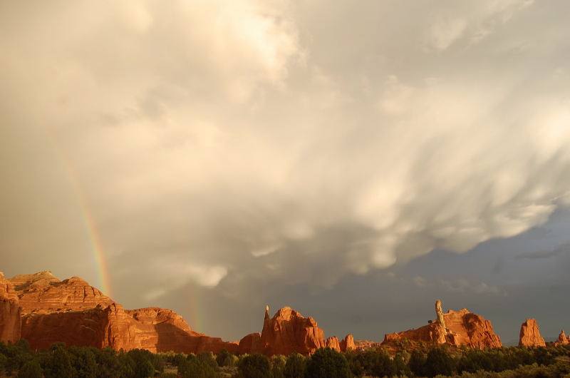 Es wurde jedoch wieder besser je weiter wir Richtung Torrey vorankamen und dann bescherte uns Petrus doch glatt schon wieder einen herrlichen Regenbogen über dem Capitol Reef National Park, so denn man was von dem gesehen hätte. Ich erinnerte mich, das wir 2008 doch auch schon einen Regenbogen in dieser Ecke fotografiert haben, bzw Herbert und dabei war ihm ja die nagelneue Nikon vom Auto gerutscht und das Objektiv abgebrochen.
