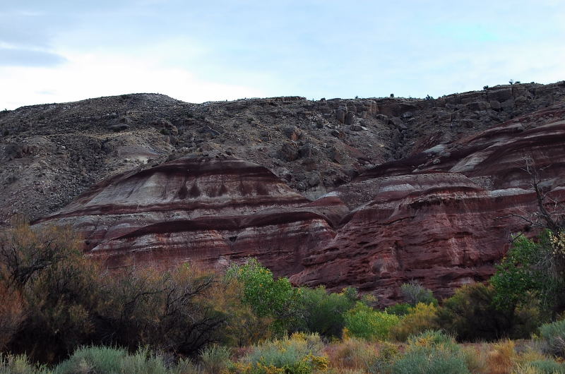 Dann passieren wir die Einfahrt zur richtigen Notom Bullfrog Road, welche wir bereits weiter unten befahren haben, nur das wir über die Old Notom Road von Hanksville kommend eingefahren sind. Und dann sind wir wieder auf vertrautem Terrain, es ist ja erst einige Tage her, dass wir hier unterwegs waren. Trotzdem ist es immer noch ein Unterschied die gleiche Straße in umgekehrter Richtung zu befahren, man sieht wieder ganz neue Perspektiven. Die Canyonwände weichen zurück und es wird erst rotbraun und wechselt dann von beige zu grauschwarz und wird wieder beigerotbraun. Also ein für deutsche Verhältnisse völlig ungewohntes Landschaftsfarbspektrum.