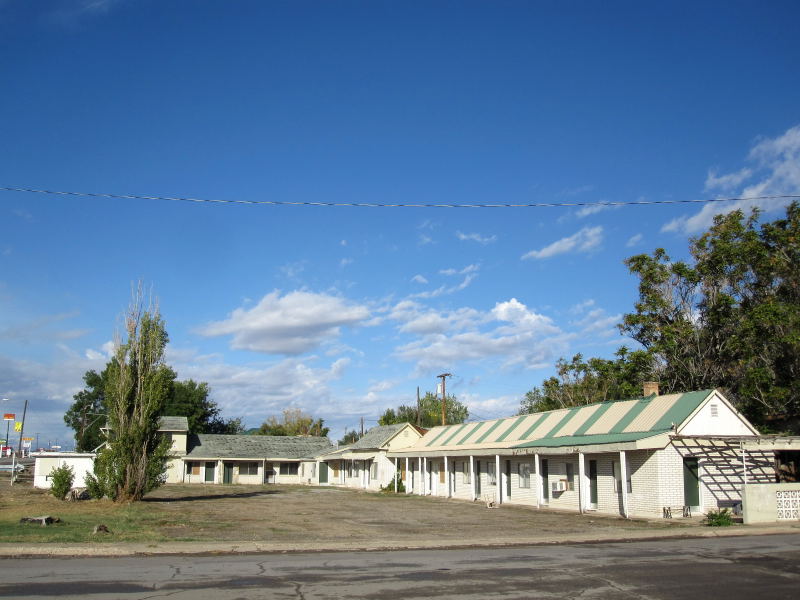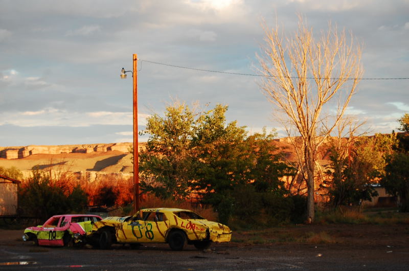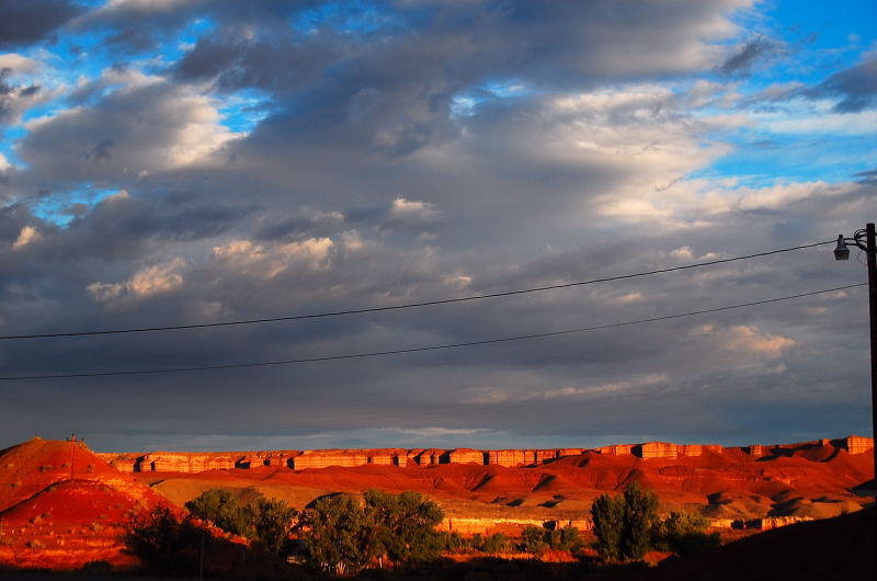 Dazwischen gibt es zumindest in flussnähe auch noch grün dazu. Kurz vor Hanksville häufen sich dann wieder die wohlbekannten Ricydlinghöfe, sprich Altauto und Gerätschaftsdeponien rund um Wohnbaracken. Ab und an sind natürlich auch vorzeigbare Unterkünfte dabei. Dann haben wir auch noch Stimmungsvolle Wolkenbilder mit Aussicht auf die Henry Mountains, über die Herbert mich mit seiner neuen Nokia X6 Navigation neulich hetzen wollte. In Hanksville steuern wir sofort wieder das vertraute Hanksville Inn an und bekommen auch problemlos ein Zimmer. Leider liegt es im Bereich der Eismaschine, also bitte die Nummern 7 bis 12 möglichst meiden, denn das Teil arbeitet die ganze Nacht durch und produziert jede Stunde geräuschvoll Eis. Zuerst dachte ich noch:“ wer braucht denn da des Nachts ständig Eis?“ Bis ich gecheckt habe, das die Eismaschine den Krach von alleine macht.