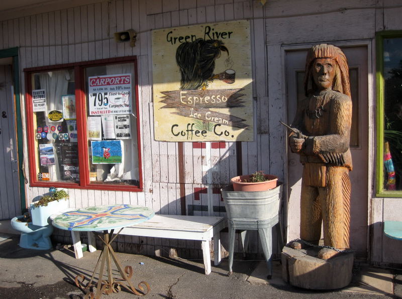 Wir entern ein kleines Cafe, von außen ganz exakt nach den Vorstellungen meines Mannes, also ein Laden in den ich nie freiwillig reingehen würde. Auch der Eindruck innen ist entsprechend, aber der kleine Laden ist recht bevölkert und es gibt einen guten Kaffee in richtig edel gestalteten Plastik-  Kaffeebechern, als Kontrastprogramm.  An Tisch neben uns sitzt wohl die gesammelte Familie des Hauses und die schwangere Mutti schmeißt das Cafe, Vati könnte der Sheriff sein, er hat so einen Stern um den Hals hängen, bei uns daheim würde ich es für ein Faschingsabzeichen halten. Nachdem er aber später in einem Auto mit der Aufschrift Highway Patrol entschwindet, ist das Ding wohl ernst zu nehmen. :mrgreen: