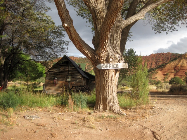 Kurz vor Torrey wird mein Süßer von einer Reihe Cabins angezogen und wir biegen  dort ein um nach einer Übernachtungsmöglichkeit zu fragen. Wir werden auch gleich herzlich an der Haustür empfangen, die Dame des Hauses hält uns für Gäste mit einer Reservierung. Nachdem dem nicht so ist, muss sie uns leider enttäuschen, denn sie hat nichts mehr frei. Der Preis wäre 79,-- Dollar plus Tax gewesen und so müssen wir weiter ziehen. Mir ist das recht, denn Torrey ist mir noch nicht weit genug für heute und es ist ja auch erst 16:00 Uhr.