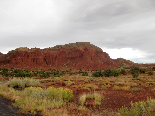 In Torrey, dem Hauptort für Besuche im Capitol Reef Park, verlassen wir die 2008 bereits gefahrene Route und durchqueren nun den Capitol Reef Park von West nach Ost. In Fruita gibt es einen kurzen Fotostopp, denn da gibt es direkt an der Straße ein paar Petroglyphs. Fruita hatte ich eigentlich für einen Ort gehalten, aber es stellt sich heraus, dass es hier nur das Visitor Center und einen Campingplatz gibt. Mehr konnte ich im Vorbeifahren nicht wahrnehmen. Die Fahrt ist sehr abwechslungsreich und wunderschön, wir filmen eine ganz Weile die Fahrt durch diesen herrlichen Canyon und genießen die gerade auch wieder Regenfreie Fahrt.  Immer wieder queren wir den Fremont River und er hat dank der Regenfälle viel schlammfarbenes Wasser.