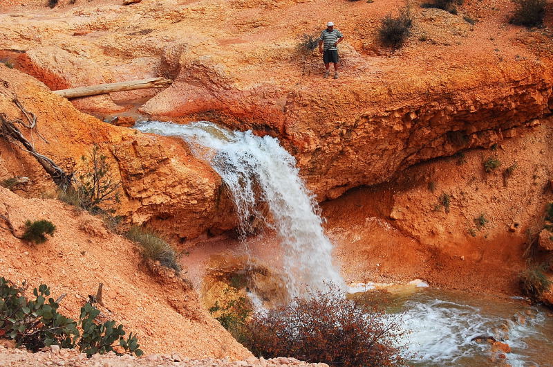 Unser kurzer Hike zum Wasserfall ist ein echter Spaziergang, 0,4 Meilen, ungefähr 700 Meter. Es geht über 2 Brücken und der Tropic Ditch, wie das Flüsschen heißt, hat doch tatsächlich eine für örtliche Verhältnisse ansehnliche Menge Wasser. Der kleine Wasserfall ist hübsch anzusehen und man kann ihn über einen Baumstamm queren, das ist natürlich nur etwas für mutige. Herbert hat das bereits bewältigt bevor ich am Wasserfall ankomme. Diesmal war er ausnahmsweise schneller, denn ich habe mich etwas intensiver mit der Nikon befasst, weil ich am Wasserfall etwas probieren will.  :kratz: