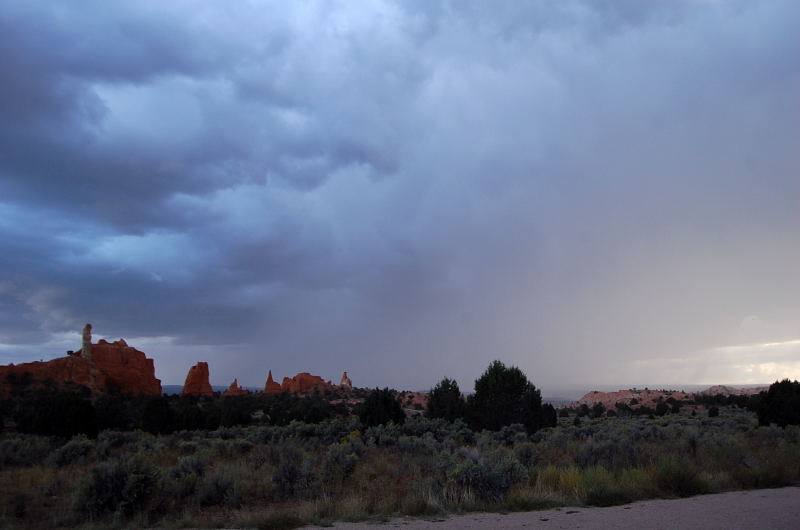 Da wir heute keine bestimmten Pläne haben, starten wir gegen 8:20 Uhr Richtung Cannonville, von der CCR haben wir erst mal die Nase voll. In Cannonville gibt es ein Visitorcenter, dem statten wir mal einen Besuch ab. Dort bekomme ich einige Auskünfte und eine nigelnagelneue, kostenlose Utahkarte. Die Wetteraussichten sind bei 40 Prozent Regenwahrscheinlichkeit, Dirtroads sind also heute weniger angesagt. Es ist mit Thunderstorms zu rechnen. :zuberge: