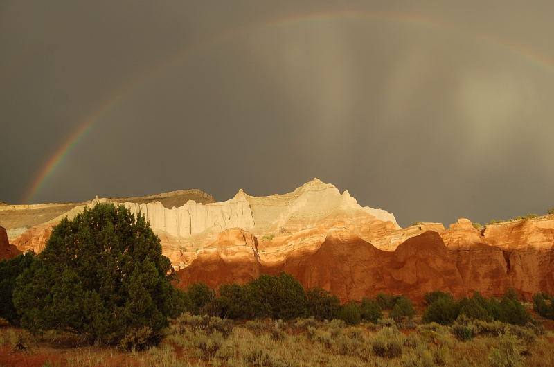 Gegen Ende des Gewitters gibt es dann noch einen wunderschönen Regenbogen, manchmal ganz leicht sogar in doppelter Ausführung. Also fotografieren alle wie verrückt, jetzt müsste man ein vernünftiges Weitwinkel haben. Auch die Stimmung über dem Kodachrome ist ein Traum. Die Sonne gibt noch eine Abschiedsvorstellung und die roten Felsen glühen vor den weißen. Das ist ein grandioser Tagesabschluss.