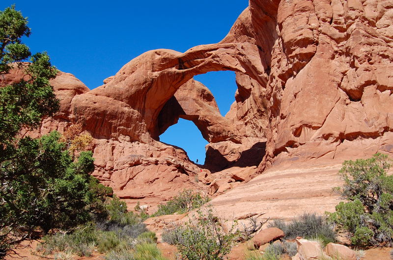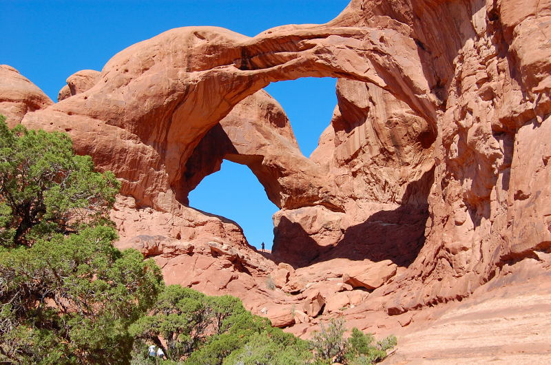 Der Double Arche ist ebenfalls riesig, von den Bildern her habe ich mir die Dinger nicht so groß vorgestellt, sonst hätte ich wirklich an die Anschaffung eines Weitwinkels gedacht. Also versuche ich die bestmögliche Ablichtung mit meiner mangelhaften Ausrüstung und versuche ein Flugzeug mit aufs Bild zu bannen, welches ganz klitzeklein gerade über/hinter den Arches vorbeifliegt. Kann wahrscheinlich nur bei vielfacher Vergrößerung wahr genommen werden.  Der Double Arche hat den Effekt einer riesigen Halle und erzeugt dadurch ein Echo. Das haben ein paar anrückende Kinder schnell entdeckt und nun ist es vorbei mit beschaulicher Ruhe, es gibt einen Echowettbewerb. Die Kinder haben ihren Spaß dabei.  :abklatsch: