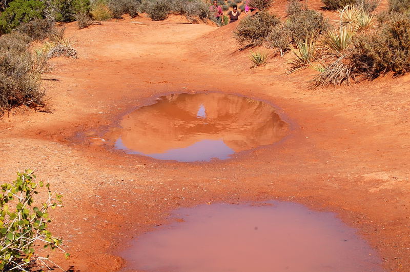 Wir erreichen den Parkplatz wieder ohne weiteren Schaden an der kryptobiotic soil crust anzurichten. Herbert hat schon genug von den roten Arches und außerdem sein Sudoko mit dabei. Also lässt er sich im Blacky nieder und ich bekomme den Auftrag schöne Bilder vom Double Arche zu machen. Na ob ich dem gerecht werden kann, er hat da ja echt hohe Ansprüche. Ich ergattere noch ein paar Nummernschilder, langsam bräuchte ich eine Liste welchen Staat ich schon habe, und dann geht es los in Richtung Doppel Bogen. Der Weg ist nicht weit und es gibt wieder schöne Pfützen mit Spiegelungen.