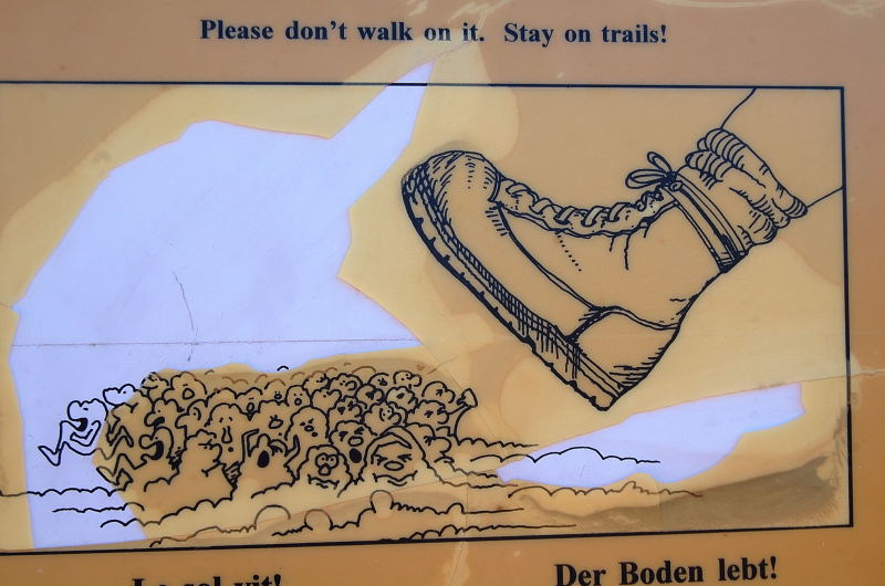 Doch da ist kein ausgewiesener Pfad und auf denen sollte man und frau auch doch bitte tunlichst bleiben. Denn wenn alle kreuz und quer trampeln, was natürlich viele tun, wie Herbert auch, zerstören wir dabei doch die wertvolle kryptobiotic soil crust. Diese kryptobiotic soil crust (ich mag den Begriff irgendwie), schützt den Sandigen Boden vor Abschwemmung und ist überhaupt lebendig, wird auf vielen Hinweistafeln erklärt. Also, da kann man doch nicht einfach drauf rum trampeln. Aber viele Touris sind halt Touris und überall auf der Welt ziemlich gleich.  :fluester:  :dozent: