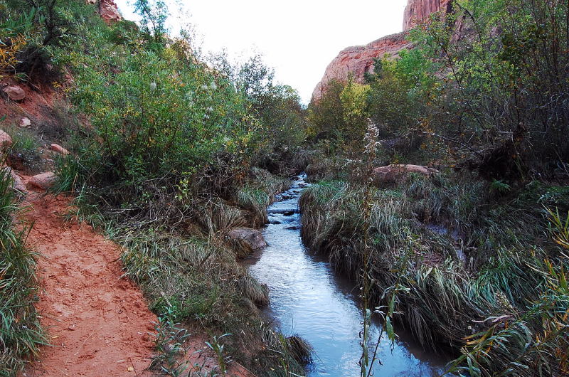 Es ist ein angenehmer Pfad, welcher immer wieder direkt an den Wasserlauf heranführt und schöne Blicke und Fotospots auf Wasserkaskaden zulässt. Mal geht es durch grünes Buschwerk, mal über Felsen, es macht richtig Spaß. Ich entdecke riesigen Winterschachtelhalm und vertraute, heimatliche Pflanzen neben fremden Wüstenbewohnern. Hier sind Feucht-und Trockenpflanzen nah beieinander.