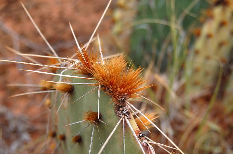 Wir wandern vielleicht einen guten Kilometer in den Canyon hinein und dann fällt meinem kritischen Blick gen Himmel auf, dass die Wolken immer dusterer werden und das ist ein Alarmzeichen für eine Flashfloodscheue Hikerin wie mich. Ich versuche mich erst zu beruhigen und gehe noch etwas weiter, doch der Himmel lässt mir keine Ruhe mehr und ich kann die Wanderung nicht mehr genießen. Also blase ich zum Rückzug, da auch noch lange kein Ziel (großer Arche)aus zu machen ist. Wir fotografieren noch einiges an Pflanzen und Blumen und versuchen unseren Fotos die letzten Einstellungsrätsel zu entlocken. :?: :!: