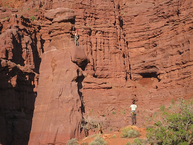Wir erkunden die Lodge ein wenig, holen uns einen Lodgeprospekt und trinken einen kostenlosen Kaffee. Es gibt ein kleines Moviemuseum, welches wir auch noch durchstreifen. Ja hier würden wir auch gerne Residieren, doch die Preise sind nicht so ganz unser Niveau. Dann geht es weiter Richtung Fisher Towers, die sind nicht so weit weg von der 128 und die wollen wir uns heute noch ansehen. Erst fahren wir etwas zu bald in die Onion Creek Road ein, stellen unseren Irrtum aber schnell fest. Die Fisher Towers sind schon zu sehen, aber die Entfernungen täuschen einen hier immer wieder gewaltig. Nachdem wir dann die richtige Einfahrt gefunden haben, geht es kurz auf einer recht guten Staubpiste bis zum Trailhead.