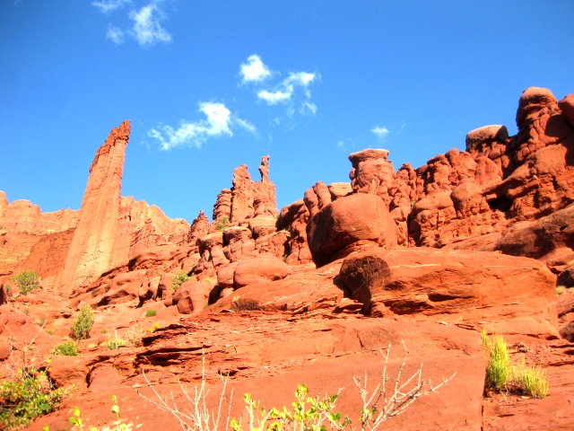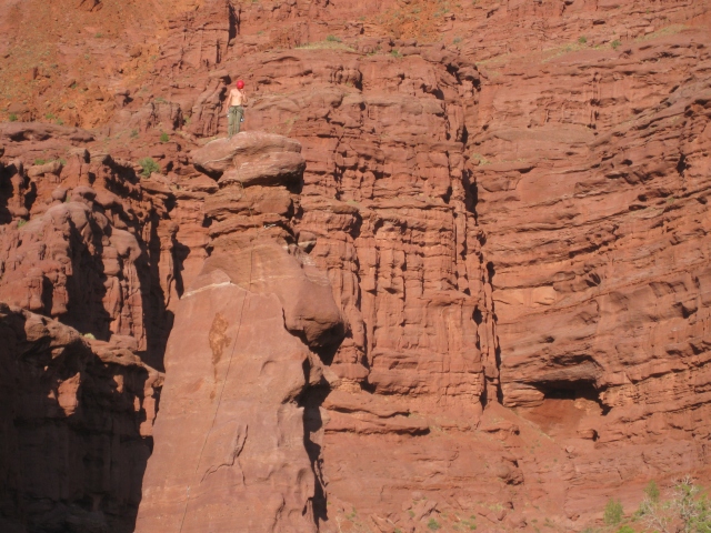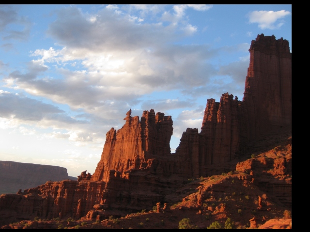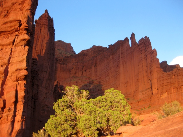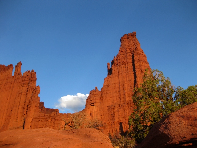 Als wir starten ist es nämlich schon fast 17:00 Uhr. Der Trail ist sehr abwechslungsreich mal runter, meistens rauf, durch eine Utahrote Felsenlandschaft, das Abendlicht wirft seine schönen Schatten. Die Fisher Towers sind wirklich imposant. Sie wirken schon von weitem, aber je näher man ran kommt umso eindrucksvoller werden sie. Riesige, senkrechte Steilwände mit einer wunderschönen Struktur aus rundem, rotem, fantasiebeflügelnden Felsgestein. Es gibt Hoodos zu bewundern und wunderschöne Fernblicke in Richtung Castle Valley, welche an das Monument Valley erinnern.