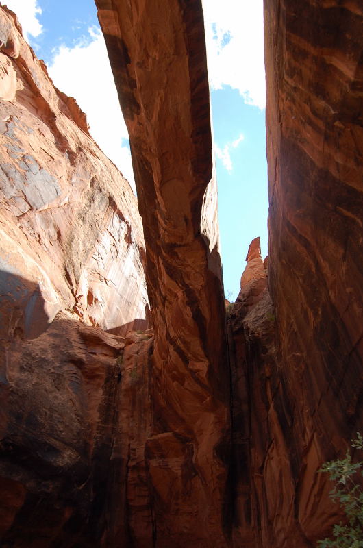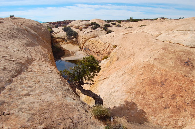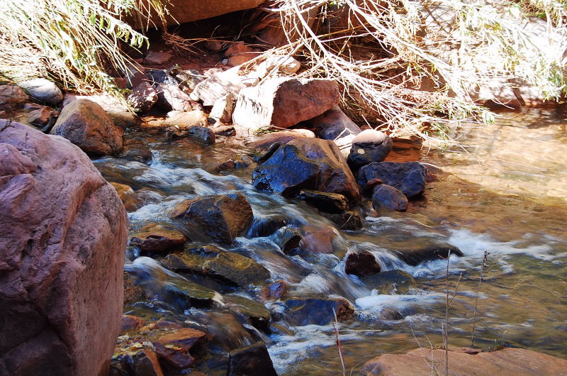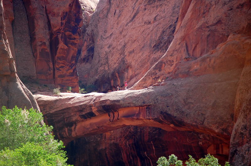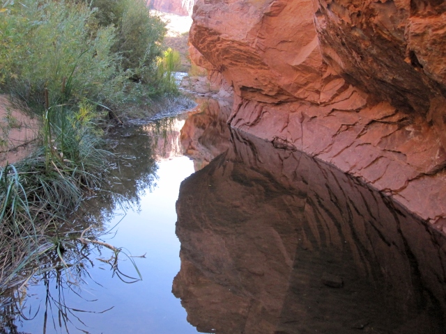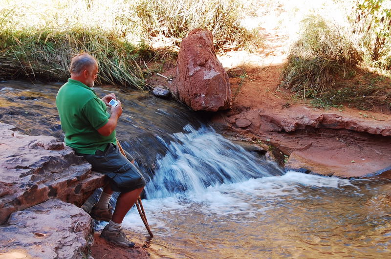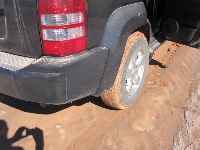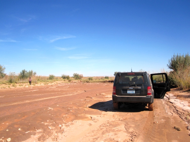 Der Weg dorthin wird dann schon mal zum kleinen Abenteuer, da wir einen Jeep mit High Clearence und Allradantrieb haben und Justin das natürlich sofort abgecheckt hat, ist ihm wohl nach Action. Er lotst mich also gleich mal in einen Wash in Richtung zum Hogen. Am Anfang geht das ja noch, da der Wash schon ziemlich trocken ist, doch es sind immer wieder feuchte Stellen zu durchqueren. Die Sache ist so gar nicht nach meinem Geschmack, doch die Jugend amüsiert sich prächtig und ist begeistert, zumindest die Jungs. Ich fürchte nun bald mal stecken zu bleiben, denn unsere Reifen sind schon gefährlich mit rotem, schmieriger Erde verklebt und fangen an durch zu drehen. Es sind auch immer mal wieder hohe Sandstufen zu queren und schließlich trete ich in Fahrstreik und beantrage eine ordentliche Route. Herbert übernimmt dann das Steuer. Als dann nur noch vorwiegend feuchter Wash vor uns liegt steigen wir alle aus und es wird per Fuß eine fahrbare Route gesucht. Der Hogan ist zwar schon in Sichtweite, nicht aber die Straße dorthin und wir stehen mitten im Wash.