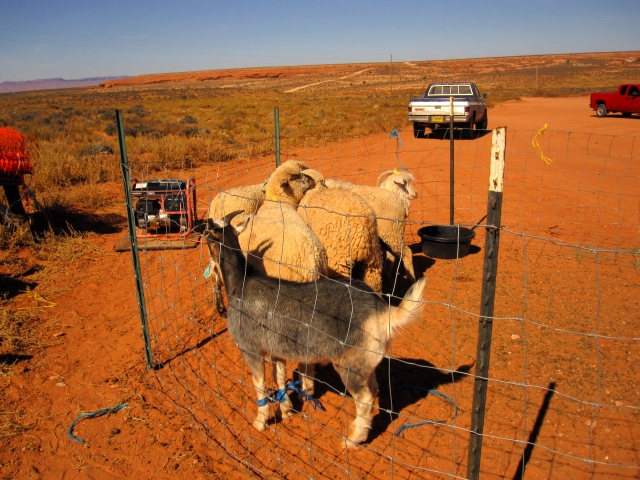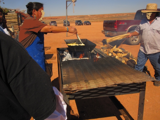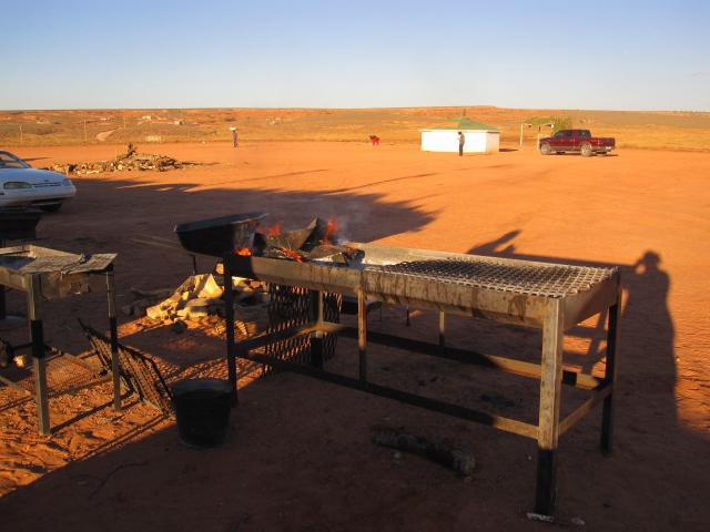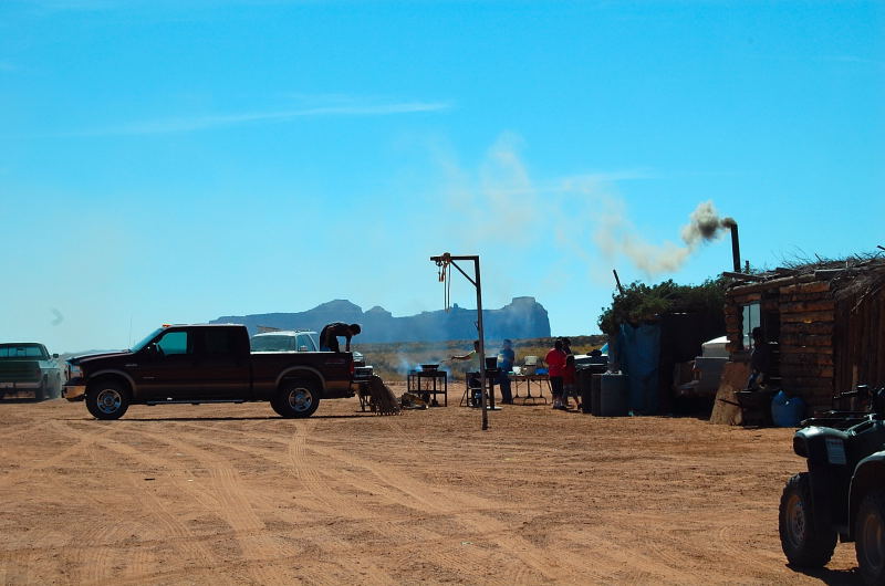 Auf dem Zeremonienplatz ist mächtig was los, es stehen jede Menge Autos rum um eine Ansammlung von notdürftig errichteten Hütten, welche wohl mehr dem Schatten, als dem Schutz vor Wind und Wetter dienen sollen. Es erwartet uns ein geschäftiges Treiben, es werden Schafe geschlachtet und zerteilt und eine Gruppe von Frauen backt und brutzelt Frybread, eine Navajo Spezialität. Wir werden bestaunt und begrüßt und vorgestellt, Omas Schwestern und deren Töchter und deren Kinder und so weiter und so fort. Da schwirren Namen wie Esther, Vera, Malcolm, Teresa und noch viele mehr in der Gegend herum und ich verstehe die meisten erst nach nochmaligem Nachfragen. Hände schütteln beim Neuankommen ist wichtig lernen wir, aber bitte nicht zu fest sondern nur ganz leicht. Für die Freundin von Justins Bruder ist das alles genau so neu wie für uns und so fühlen wir uns nicht so ganz allein in dieser fremden, andersartigen Welt.