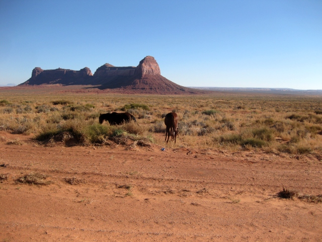 Die schöne Anfahrt wird nun nur noch im vorbeifahren genossen, Fotos davon haben wir jetzt schließlich genug. Die Ansiedlungen von Monument Valley erscheinen uns gewachsen zu sein, wir sind nun ja schon das 3. Jahr in Folge hier. Bei der Anfahrt nach Oljeto begegnen wir diesmal Pferden an der Straße. 2008 waren es Schafe, letztes Jahr Kühe und nun sind die Pferde dran. Sie laufen frei herum, aber es sind keine Wildpferde, sie gehören jemandem, das wissen wir von Justin.