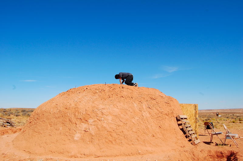 Dann wird die Navajo Behausung inspiziert und bewundert. Die Erde mit welcher das Holzgerüst des Hogans nun verkleidet ist, wurde direkt neben dem Hogan ausgegraben und deshalb sind nun rund um den Wohnhügel lauter Löcher. Eine Sperrholztür bildet den Eingang und drinnen stehen etliche Klappstühle. Licht kommt außer durch die Tür noch von einer quadratischen Öffnung in der Mitte des Hogans, welche mit Folie verkleidet ist. Diese Öffnung ist für den Rauchabzug. Während wir uns alles genau ansehen geht Justin mal wieder für Schießübungen mit seiner Knarre in die Umgebung und sucht geeignete Ziele.