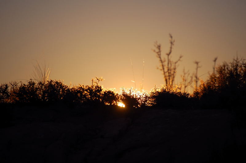 Meine Nacht ist recht durchwachsen, ich habe das Gefühl viel wach zu liegen, aber nachdem immer viel Zeit vergangen ist, muss ich doch wohl immer längere Schlafphasen gehabt haben. Kalt ist mir nicht, aber das Schlafen im Schlafsack habe ich halt selten trainiert und die Vorstellung irgendwelche Tierchen könnten um mich herum krabbeln trägt nicht zur Nachtruhe bei. Durch die Palstikfolienluke in der Decke kann ich den Sternenhimmel sehen und das ist nun schön auch wenn es nicht beim Einschlafen hilft. Einmal in der Nacht, als ich gerade wach liege, höre ich seltsames Heulen in der Ferne. Das könnten durchaus Coyoten gewesen sein, Angst macht es mir nicht, bin ja schließlich im Hogan und Justin hat die volle Ausrüstung dabei: Pistole und Messer.