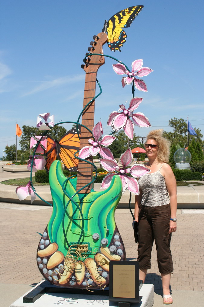 ob ihr wollt oder nichtMontag, 27.08.2007Das Frühstück war o. k. und gestärkt ging es heute zuerst nach Cleveland (71° F). Auf dem Weg dorthin sah man viele Weinanbaugebiete und 2 ½ Stunden später erreichten wir Cleveland. Dort schauten wir uns von außen und ein bisschen von innen das Rock and Roll Hall of Fame und Great Lakes Science Center, das sicherlich auch zum anschauen sehr interessant gewesen wäre. Interessant war draußen vor dem Hall of Fame die bunt gestalteten Gitarren in Übergröße, die jeder Künstler auf seiner Art und Fantasie gestaltet hatte. Es wurde übrigens immer wärmer, aktuell 77° F.