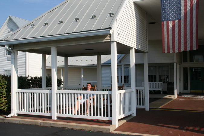 Motel The Inn Amish Acres, im Schaukelstuhl Jürgen (mein Mann)Das Haus war in Amish-Stil eingerichtet, mit netten alten Dingen. Der erste Gast wurde am 06.05.1989 begrüßt. Seit dem gibt es zur Begrüßung ein großes Glas Apple Butter und für jeden ein Kuchenstück und O- oder A-Saft frisch gepresst. Das Motel verfügte über einen Außenpool, den wir sofort in Beschlag nahmen. Das Poolwasser war zwar frisch, doch nachdem man ein paar Runde geschwommen war, war es eine Erfrischung. Ein bisschen in den gemütlichen Liegen gesonnt, bevor es zum Country Table (eine Empfehlung von der Lobby) ging.