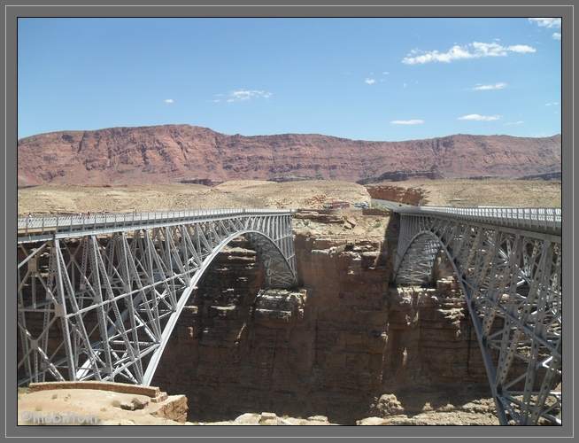 Der Grand Canyon war ein sagenhaftes Erlebnis, es wird sicher lange dauern, bis wir die Eindrücke verarbeitet haben. Wir hätten gerne noch einen halben Tag mehr gehabt, aber leider ließ dies unser Zeitplan nicht zu und wir mussten uns heute Morgen wieder auf den Weg machen. Mittlerweile haben wir uns an die langen Fahrten wirklich gewöhnt, unser erstes Zwischenziel war die Navajo Bridge, die unweit unserer Route lag. Der kleine Umweg lohnt aber absolut, besonders da die Farben der Berge im herrlichen Kontrast zu den Brücken stehen.
