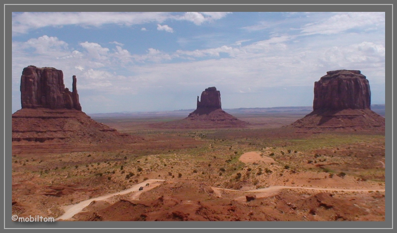 Monument Valley Navajo State Park deuteten sich die weltberühmten Felsformationen am Horizont an. Im Valley selbst war es zwar stark bewölkt, die Sonne kam aber immer wieder zum Vorschein und beleuchtete die Felsen. Vor der Fahrt über den 17 Meilen langen