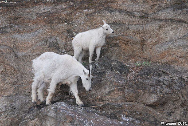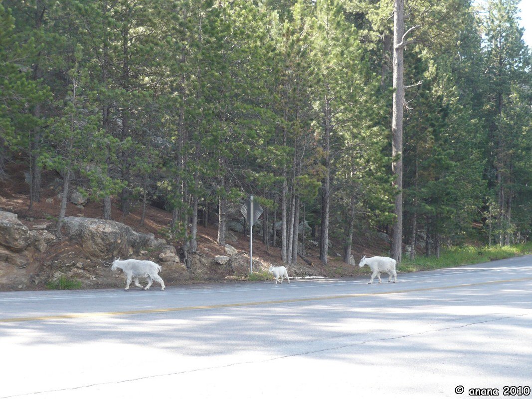 Erst nach einer ganzen Weile können wir uns trennen und trauen unseren Augen kaum, als wir direkt 2 Kurven nach Mt. Rushmore über diese süßen Tierchen (Rocky Mountain Bergziegen, eigentlich wohl korrekter eine Gemsenart wie ich nachgelesen habe) stolpern, die hier seelenruhig über die Straße laufen und auf der anderen Seite im Gebüsch zu verschwinden. Natürlich nicht ohne Fotostopp: