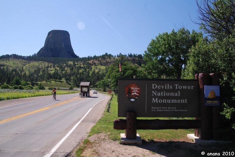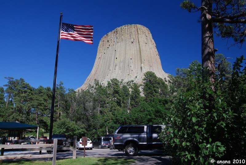 Nächster Halt: Der Devils Tower. Es handelt sich um einen übriggebliebenen Schlot eines Vulkans, der ursprünglich einmal vorhandene Berg drumherum war wohl aus leichterem Material und von der Erosion abgetragen. Es gibt auch eine nette Indianerlegende von einem Bär, der mit seinen Krallen die tiefen Furchen in den Berg geritzt hat.