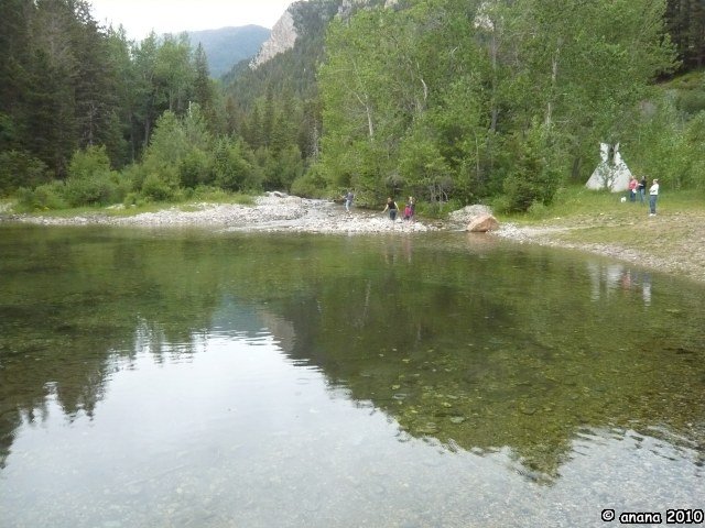 Nach dem Abendessen gehen wir an den aufgestauten Teich (gespeist aus dem Gebirgsbach, oben liegt noch Schnee, ihr könnt die Temperatur erahnen  :bibber:) und rösten Marshmallows im Tipi (lecker, mit Graham Crackers und Schoklade, dazwischen der Marshmallow - süße Schweinerei).