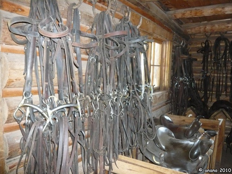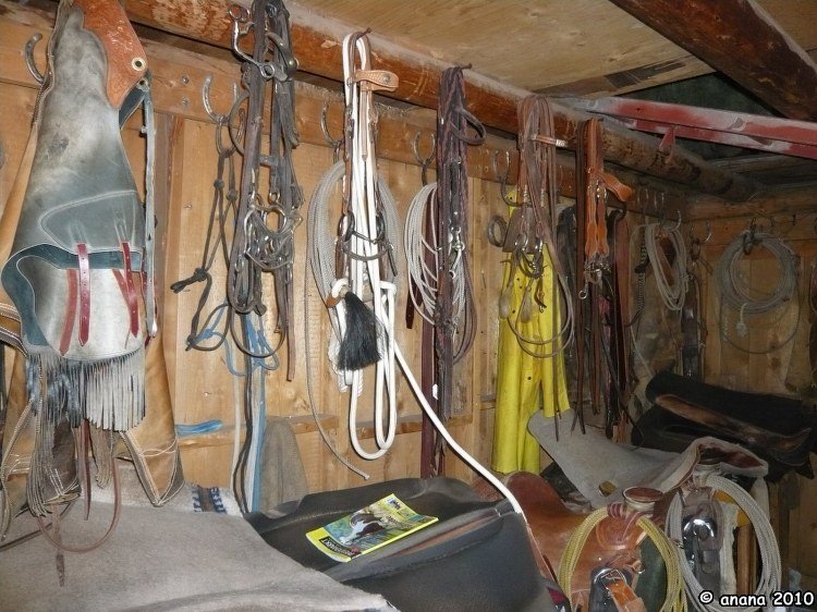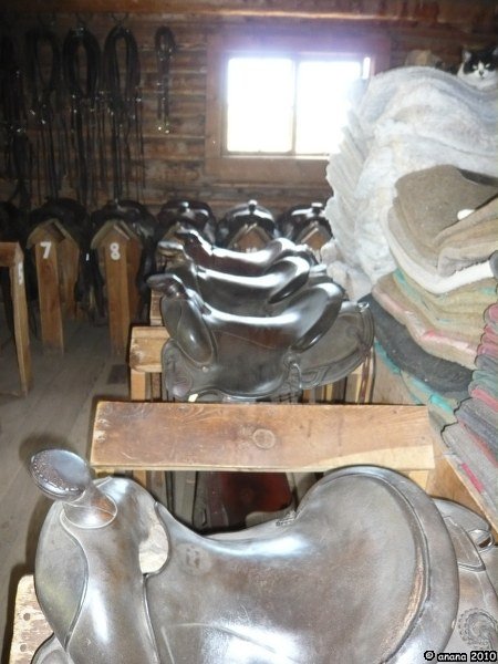vorher noch ein Blick in die Stallhütte, die weniger Stall als vielmehr Sattel - und Zubehörkammer ist (man beachten den Schlafplatz der Katze