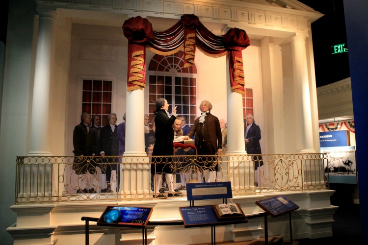 Die Schlange davor war noch nicht also groß, und wir stellten uns dazu. Die Besucher wurden immer nur stoßweise rein gelassen, aber dann kamen auch wir mit den nächsten Schub mit rein. Nun standen wir erst vor der Sicherheitskontrolle und hier herrschte Kasernenton. Kein Essen und keine Getränke durften mit ins Gebäude. Wir waren ja brave Touristen, und hatten nichts dabei und schafften auch diesen Sicherheitscheck ohne Beanstandungen. So als geübter US-Tourist, weiß man ja welche Gegenstände man auf keinen Fall bei sich führen sollte, wenn man plant irgendwas zu besichtigen. Nun mussten wir noch einmal anstehen um die Eintrittskarten zu bekommen. Nachdem wir diese hatten, mussten wir uns wieder einer Schlange anschließen und warten. Wir bekamen Kopfhörer und wurden dann in einen großen Kinosaal geführt. Dort bekamen wir in einen Film die Geschichte des Capitols erklärt. Als der Film, der gar nicht mal schlecht war beendet war, wurden wir von unseren Guide in Empfang genommen. Als wir die Rotunde betraten, überkam einen doch ein bisschen Ehrfurcht. Die Rotunde hat einen Durchmesser von 29,26 m und erreicht in der Mitte der Kuppel eine Höhe von 54,94 Meter. Uns blieb genug Zeit uns hier umzuschauen, und bekamen viele Einzelheiten erklärt. Zum Beispiel das der Fries unter den 36 Fenster in der Kuppel 19 Szenen aus der amerikanischen Geschichte darstellt. Außerdem alles über die acht 3,6m x 5,5 m großen Ölgemälde in den Nischen. Vier davon zeigen die Entdeckung und Kolonialisierung Amerikas, und die anderen vier Szenen von der Amerikanischen Unabhängigkeitsbewegung.
