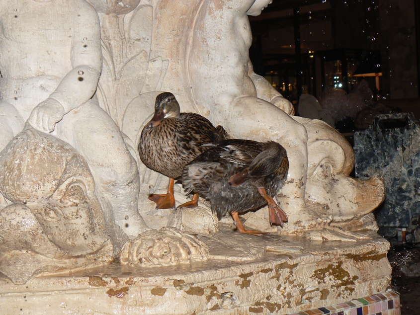 ALSO. Im Jahr 1932 kamen Bob und Bill (ich nenne die jetzt mal so, da ich die Namen nicht mehr weiß) nach einem „Jack Daniels - Jagdausflug - Besäufnis“ in Arkansas mit ihren drei „Lock-Enten“ zurück ins Peabody Hotel (Memphis, TN) und dachten es wäre doch suuuuuper lustig, wenn die Enten mal im Springbrunnen in der Lobby plantschen könnten. Da die Gäste das das auch sehr lustig fanden, müssen das seitdem 5 Enten (1 Mann und 4 Frauen; warum gerade 5 wissen wir nicht) jeden Tag zwischen 11 und 17 Uhr tun.