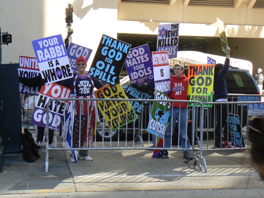 Also zunächst einmal gehen wir ins Sheraton- Hotel aufs Klo und stellen dort fest, dass eine jüdische Convention oder so was stattfindet. Auf dem Fußgängerüberweg vor dem Sheraton hat sich eine 7- (!) köpfige Demonstrantengruppe versammelt, die mit politisch unkorrekten Parolen (siehe Fotos) ihre Meinung über jüdische Mitbürgerinnen und Mitbürger kundtun.
