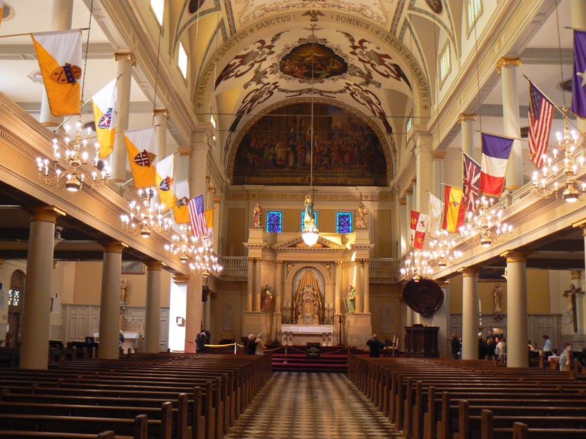 Ok, weiter in die Bourbon- Street, die gegenüber gestern wesentlich ruhiger daherkommt. Da wir nunmehr auch kapiert haben, dass die „Narlins Saints“ im letzten Februar den Superbowl gewonnen haben und somit amtierende Meister sind kaufen wir natürlich entsprechende Fan- Shirts!  Incl. der hier üblichen „Fußballschals“ in Form von bunten Plastikketten mit Anhängern dran. Die sind nämlich keine „gay“ Accessoires, sondern „Fanbekennerschmuck“ und heißen „Beads“.  Wir gehen dann zur Kathedrale (auch kurz mal rein…) und dann ins Cafe du Monde. Wir verzichten darauf, „geseatet“ zu werden (da warten nämlich schon zu viele) und setzen uns einfach an einen freien Tisch; was in Rom am Vatikan klappt, das klappt auch hier. Der Tisch ist aber über und über mit Puderzucker übersäht. Warum, das wissen wir, als wir unsere Bestellung bekommen: Unter Bergen von Puderzucker verstecken sich 6 leckere, heiße Beignets (5$), die man ohne Sauerei nicht essen kann.