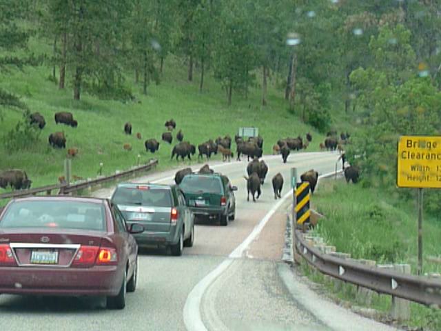 Erst außerhalb des Parkes machten wir Bekanntschaft mit der großen Herde. Sie war ebenfalls auf dem Weg zur Iron Mountain Road, sodass wir bis dorthin ca. 1,5 Stunden im Stau mit der Herde brauchten. Sie liefen zum Glück nur vor, hinter und neben uns, und nicht darüber. Für den Rest unseres Urlaubs hatten wir genug Bisons gesehen !!!