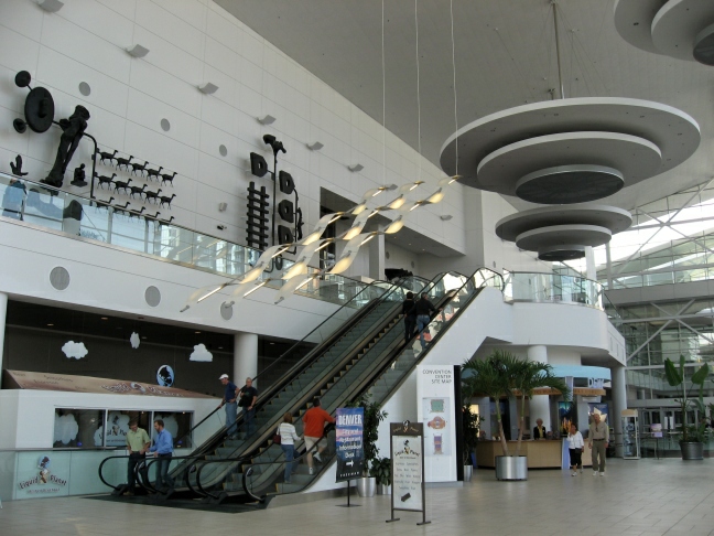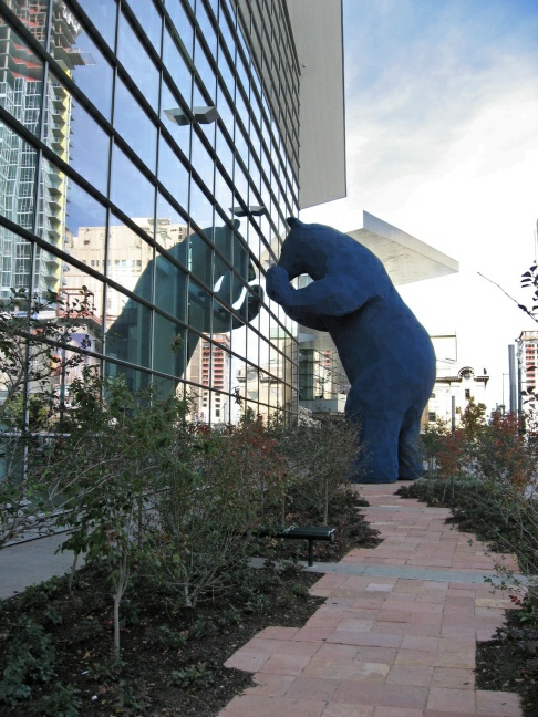 Zu guter Letzt werfen wir noch einen Blick ins Convention-Center (das mit dem blauen Bär davor). Auch hier gibt es einen akustischen Gag ähnlich wie gestern auf den Toiletten im Art Museum: wenn man innen die Rolltreppe runterfährt, fängt es aus verschiedenen Lautsprechern zu lachen an.