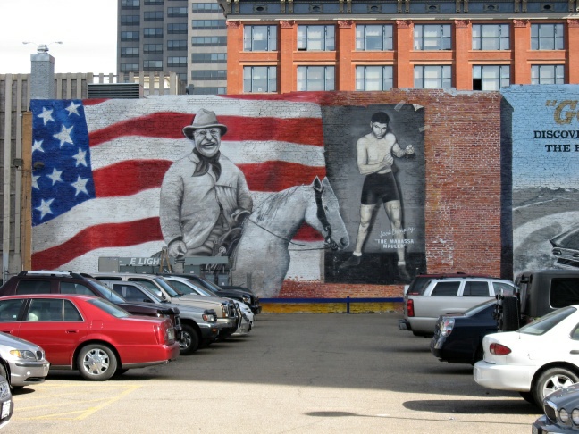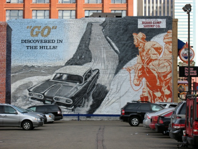 Gegenüber dem Convention Center sind ein paar öde Parkplätze, die durch Werbemurals an den angrenzenden Wänden optisch aufgebessert werden.