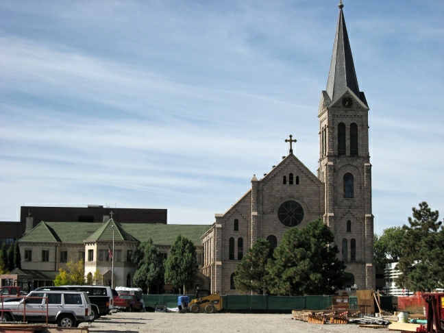 Schließlich machen wir einen Abstecher in das Universitätsgelände und umrunden eine größere Baustelle, um die Kirche St. Elizabeth of Hungary zu besuchen. Es handelt sich dabei immerhin um die zweitälteste katholische Gemeinde von Denver von 1878. Die jetztige Kirche ist aber wohl ein Ersatzbau von 1898. Für ein neugotisches Bauwerk ist sie gar nicht so schlecht. Nach meinen Recherchen muß früher zu der Kirche ein Waisenhaus gehört haben, an dem ein entfernter Onkel von mir Ende des 19./Anfang des 20. Jahrhunderts als Franziskanerpater tätig gewesen sein muß. Da er sich als (auch Kirchen-) Maler betätigt hat, wollten wir eigentlich in die Kirche hinein, um zu sehen, ob sich Spuren von ihm finden. Jedoch ist alles abgeschlossen und auf der Rückseite ist eine Suppenküche eingerichtet, wo gerade eine Speisung stattfindet, so daß wir uns nicht näher aufdrängen wollen.