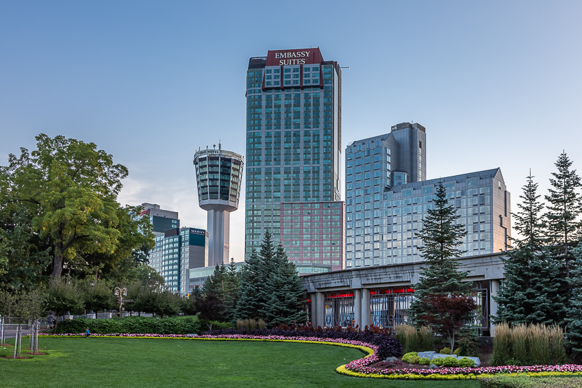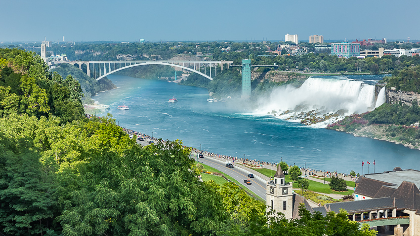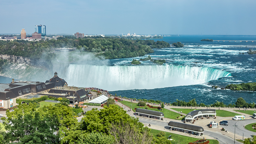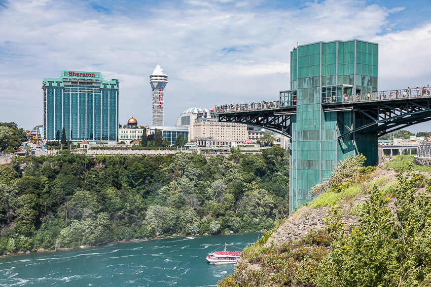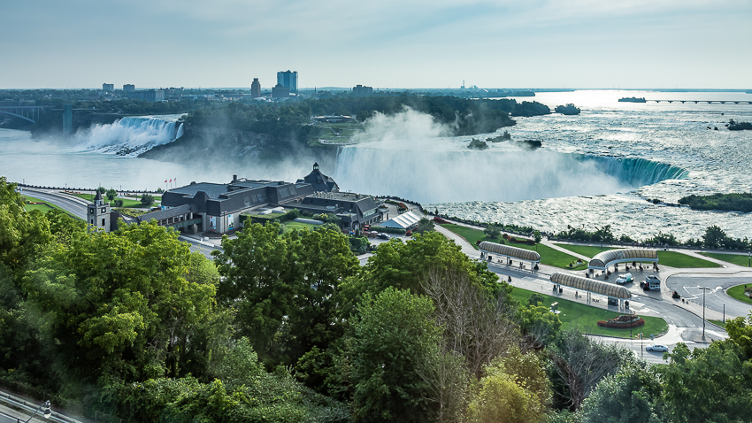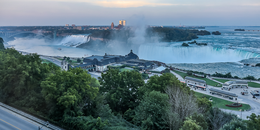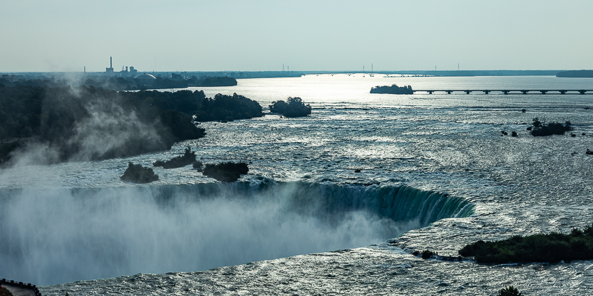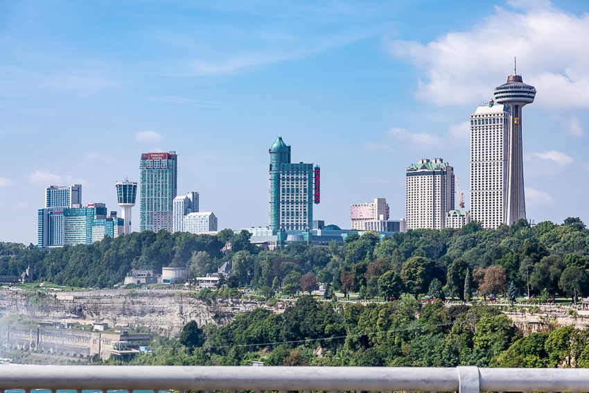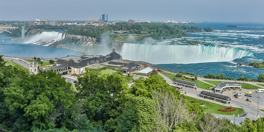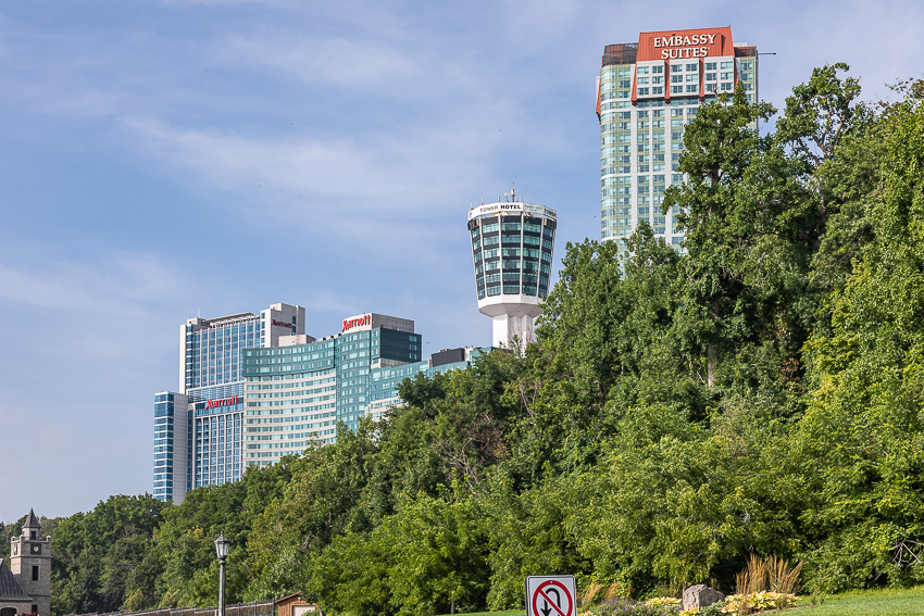 Von der ersten Bootstour ging es gleich weiter und wir fuhren nach „Niagara Falls“. Dort checkten wir in unserer Unterkunft für die nächste Nacht ein: dem „Marriott Niagara Falls Hotel Fallsview“. Während Birgit und die beiden Jungs eincheckten, fuhr ich das Auto in das ca. 5 Gehminuten entfernte Parkhaus. Valet- Parking ist uns irgendwie immer zu teuer. Wir hatten ein Zimmer im 9. Stock mit Blick auf die beiden Wasserfälle. Noch etwas höher wäre zwar schöner gewesen, es war aber anscheinend alles ausgebucht. Nachdem wir kurz die Fälle von oben bestaunten, zogen wir los - es stand uns ja noch die zweite Bootstour bevor.