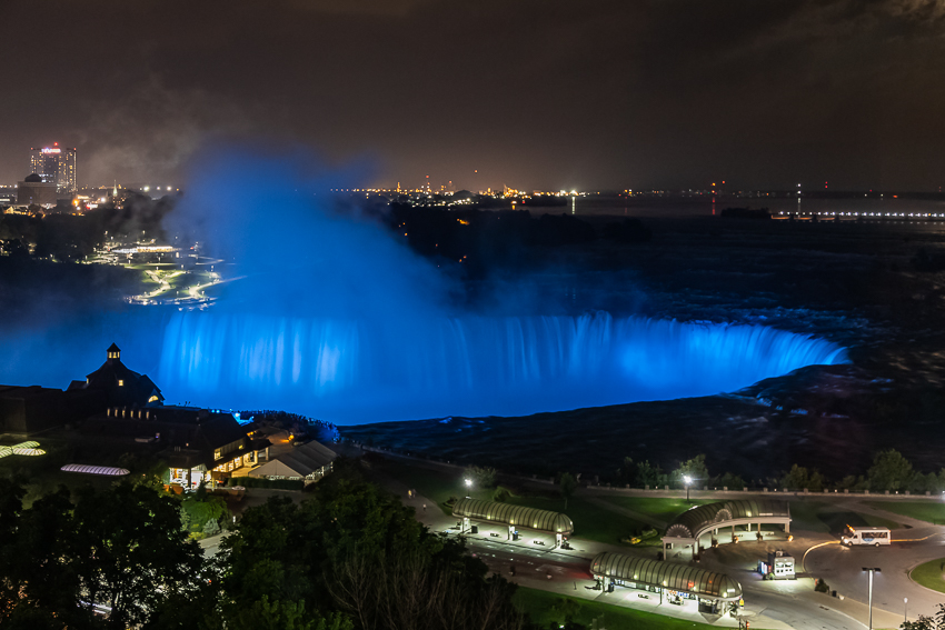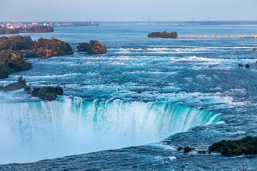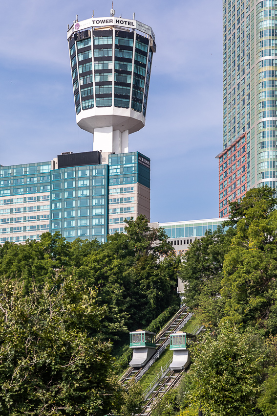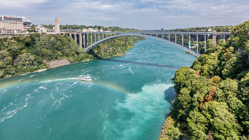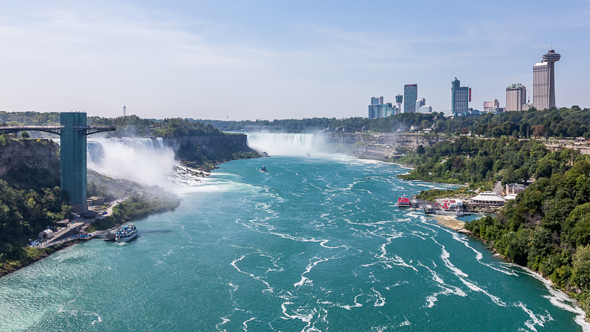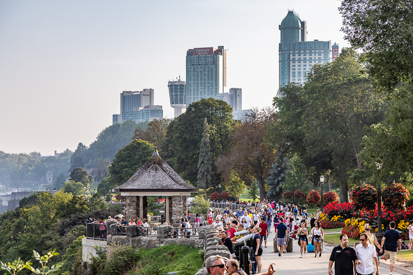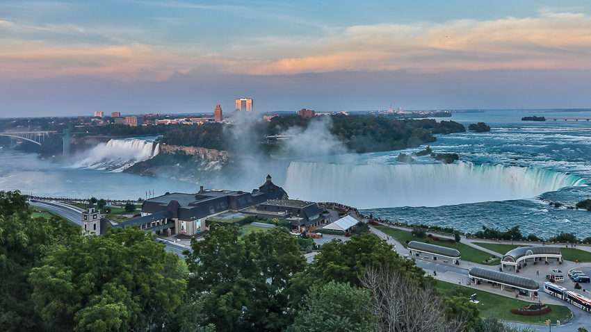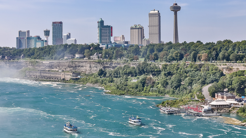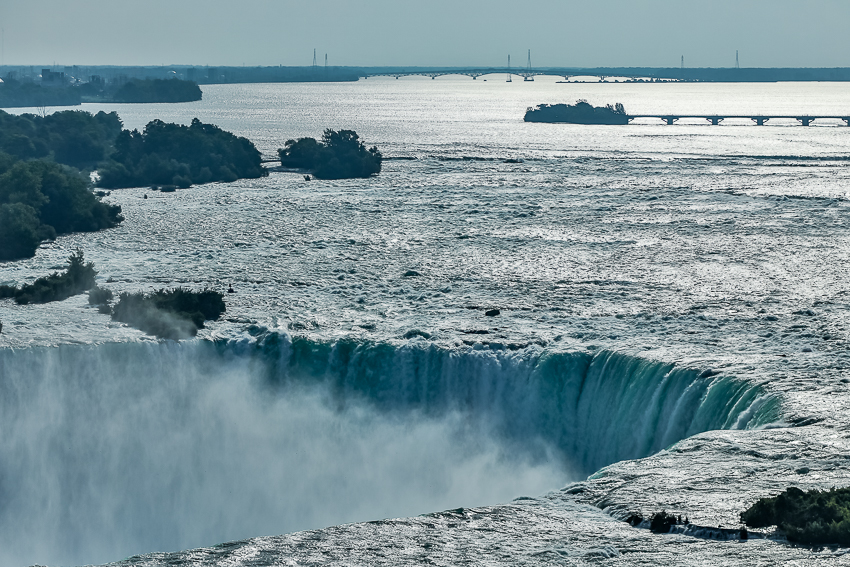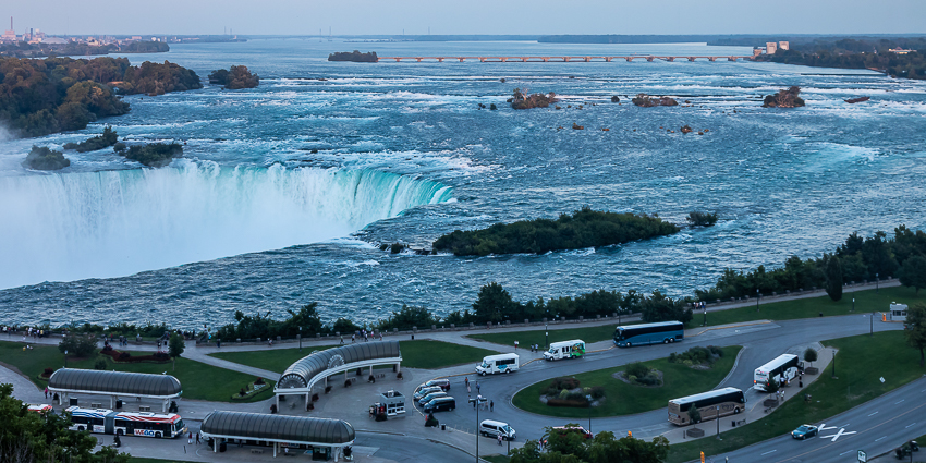 Von der ersten Bootstour ging es gleich weiter und wir fuhren nach „Niagara Falls“. Dort checkten wir in unserer Unterkunft für die nächste Nacht ein: dem „Marriott Niagara Falls Hotel Fallsview“. Während Birgit und die beiden Jungs eincheckten, fuhr ich das Auto in das ca. 5 Gehminuten entfernte Parkhaus. Valet- Parking ist uns irgendwie immer zu teuer. Wir hatten ein Zimmer im 9. Stock mit Blick auf die beiden Wasserfälle. Noch etwas höher wäre zwar schöner gewesen, es war aber anscheinend alles ausgebucht. Nachdem wir kurz die Fälle von oben bestaunten, zogen wir los - es stand uns ja noch die zweite Bootstour bevor.