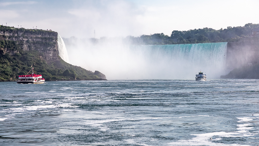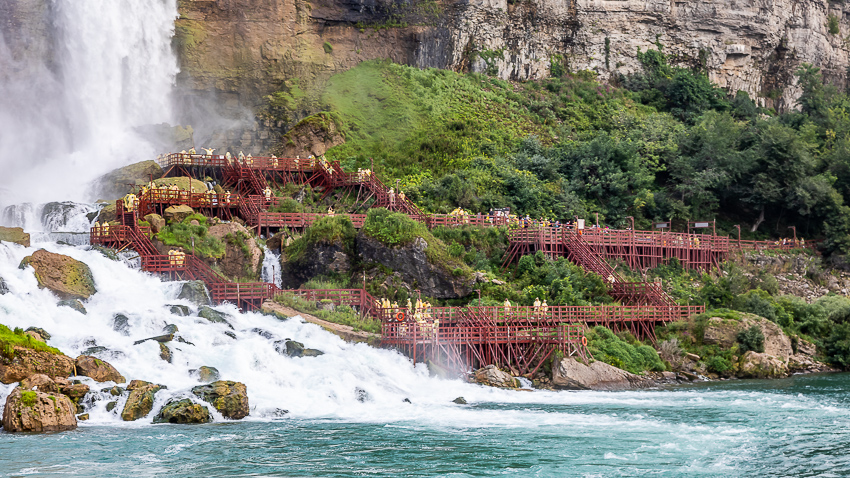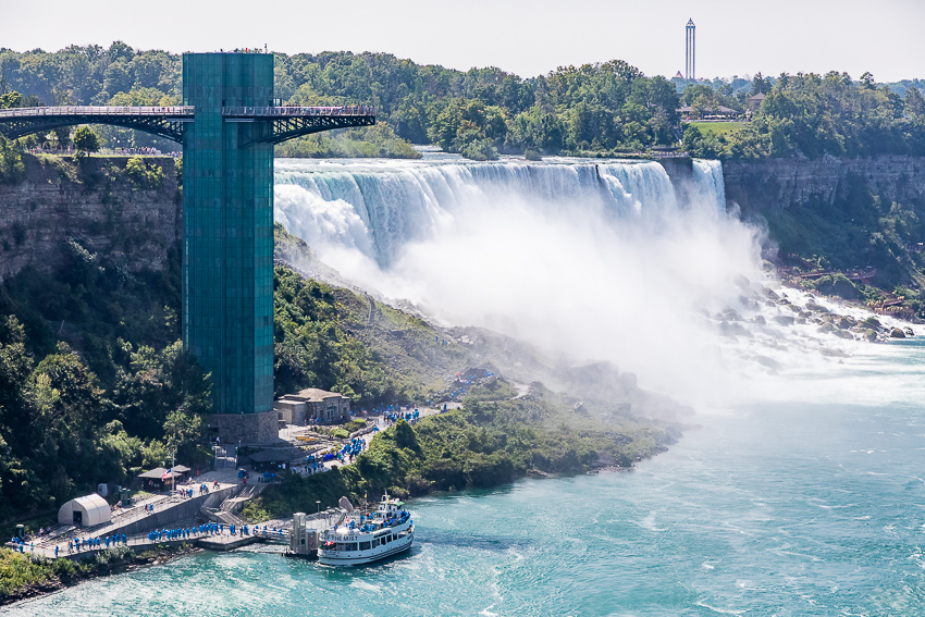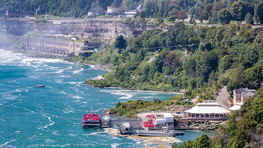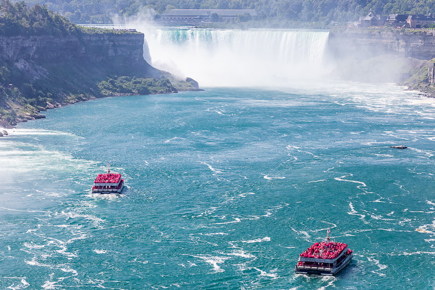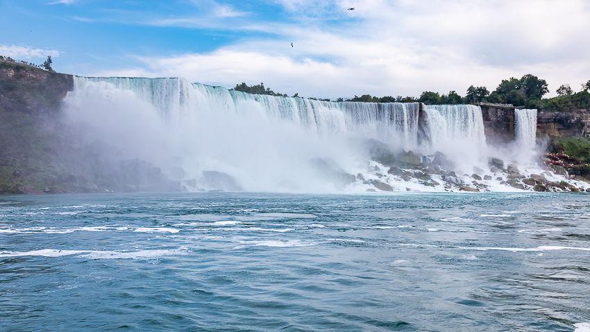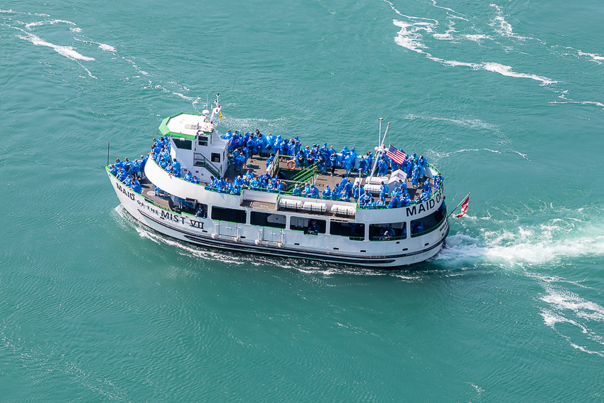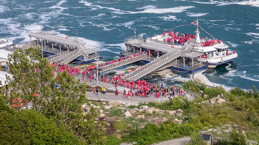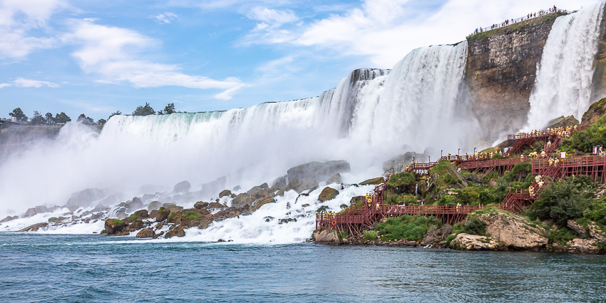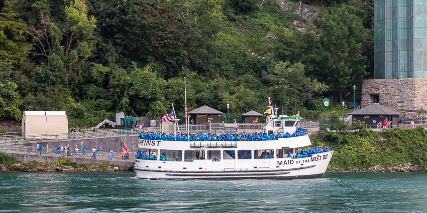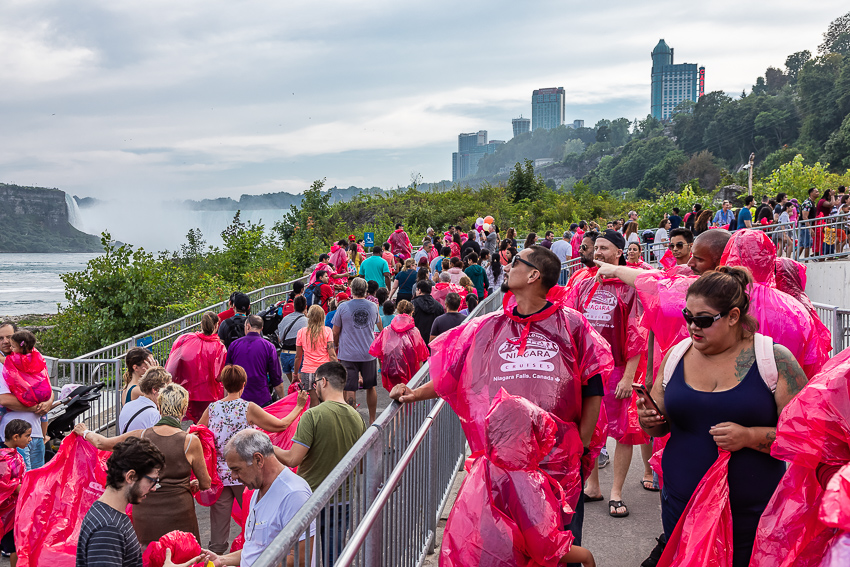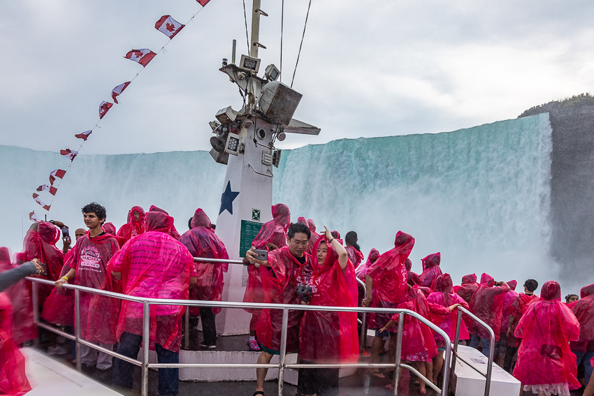 Ebenfalls für heute hatten wir noch eine Fahrt mit den „Hornblower Niagara Cruises“ gebucht. Finanziell wurde es jetzt zwar langsam etwas schmerzhaft, aber auf der anderen Seite: wann würden wir je wieder in diese doch etwas abgelegene Ecke der USA kommen? Anyway, die Tickets waren für heute gebucht, wann man fahren wollte konnte man sich einfach aussuchen. Die Tour dauerte nur ca. 20 Minuten und es fuhren ständig Schiffe vom Pier ab. Mit mehreren Aufzügen wurden die schier endlosen Massen an Besuchern nach unten zum Fluss gebracht. Dort gab es noch einen im Preis inbegriffenen Regenponcho und nachdem nach wenigen Minuten alle Mann an Bord waren, ging es auch schon los. Bereits als wir an den amerikanischen Fällen vorbeifuhren, blies ein stürmischer Wind und trotz Poncho wurde ich bis auf wenige Stellen schon wieder klitschnass.
