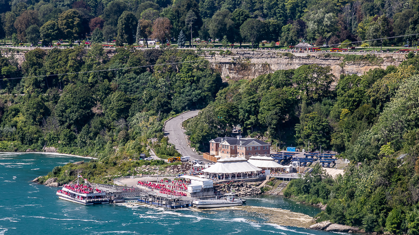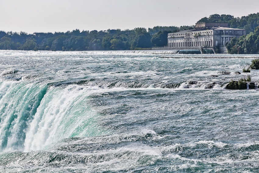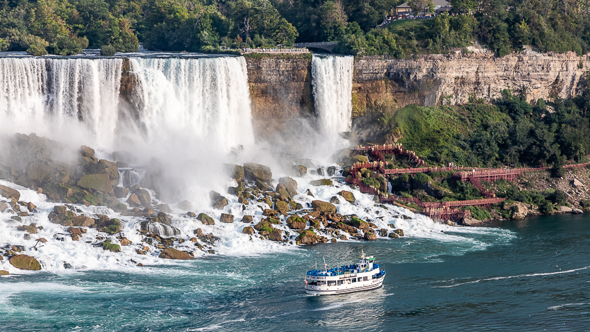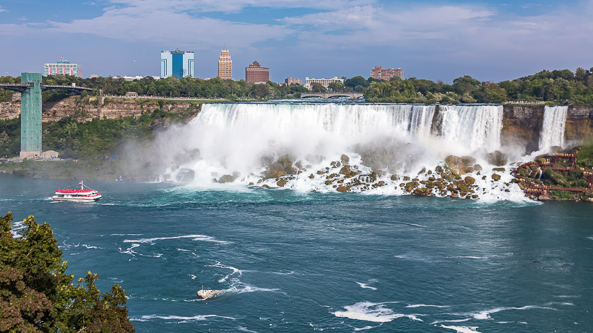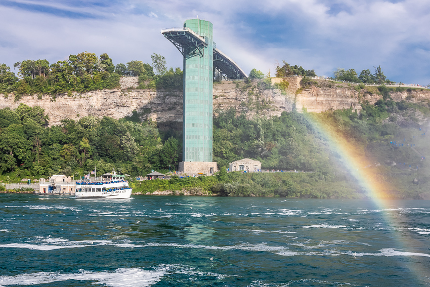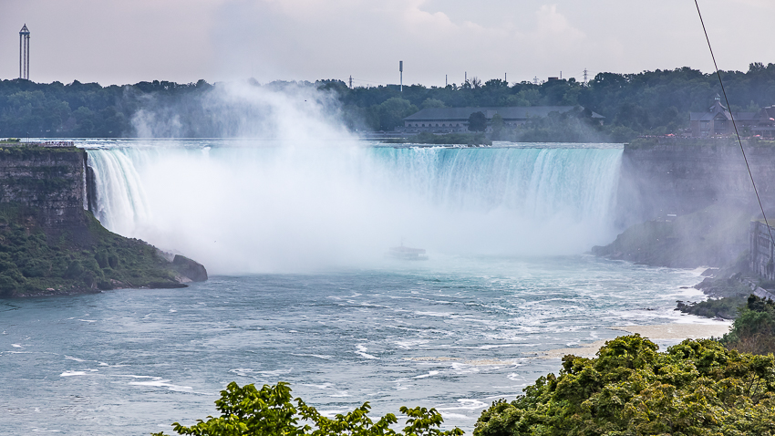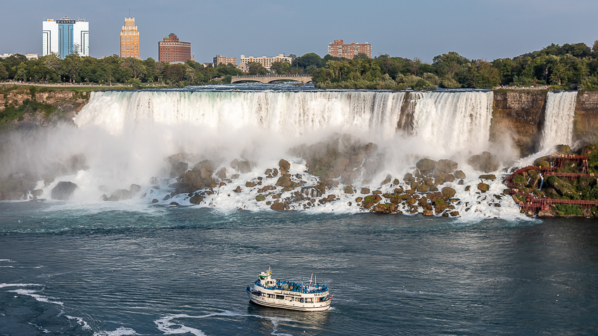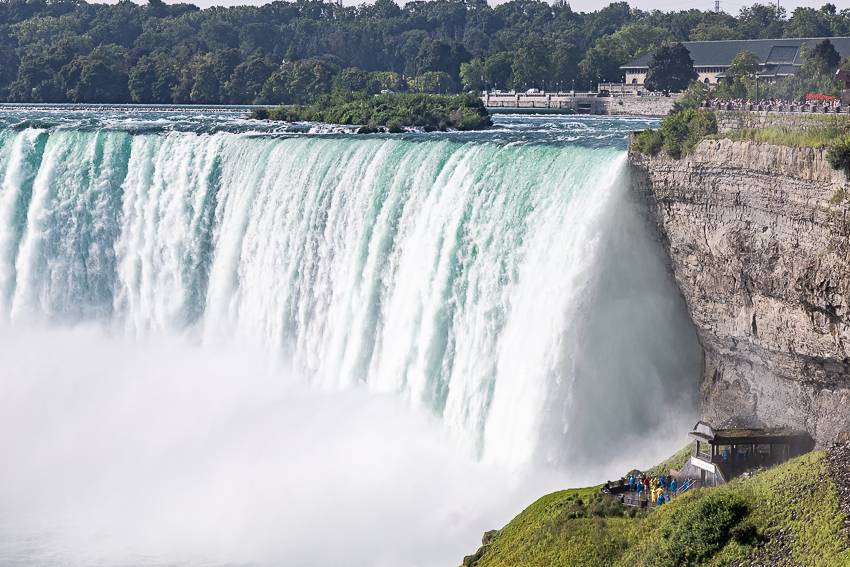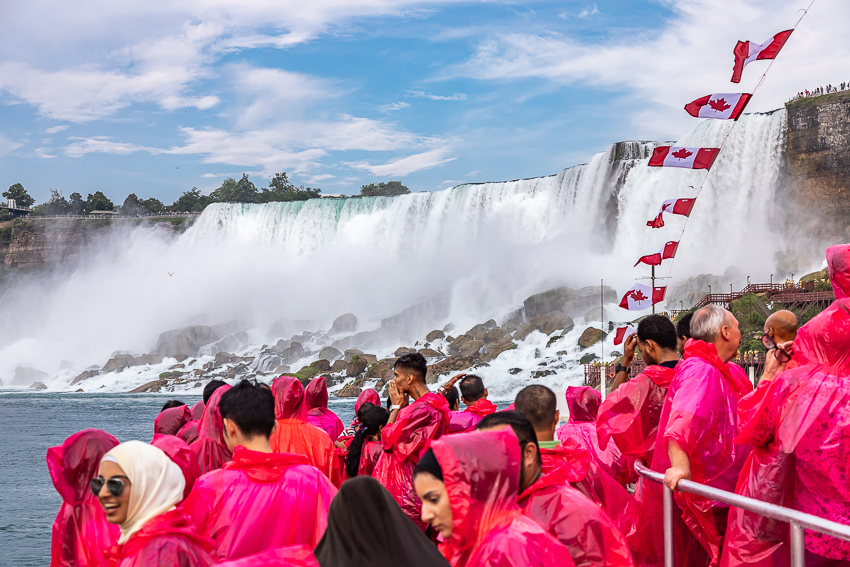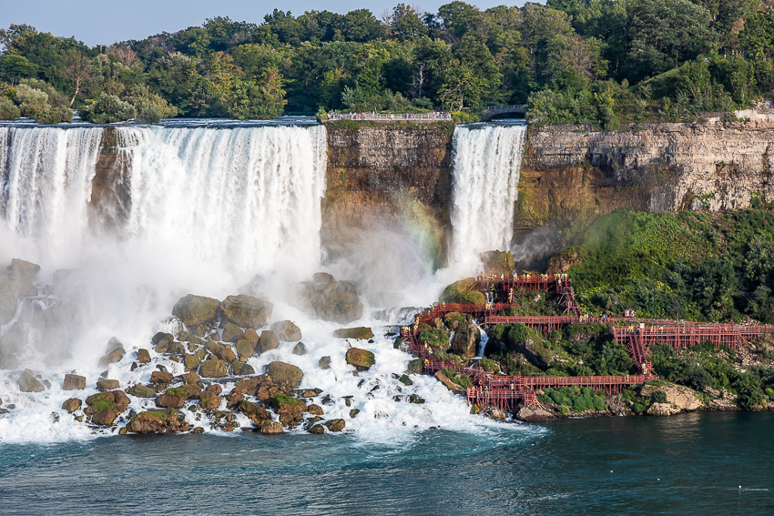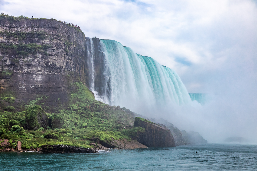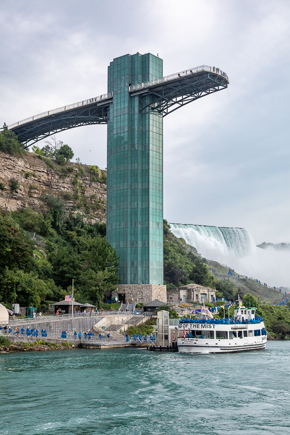 Ebenfalls für heute hatten wir noch eine Fahrt mit den „Hornblower Niagara Cruises“ gebucht. Finanziell wurde es jetzt zwar langsam etwas schmerzhaft, aber auf der anderen Seite: wann würden wir je wieder in diese doch etwas abgelegene Ecke der USA kommen? Anyway, die Tickets waren für heute gebucht, wann man fahren wollte konnte man sich einfach aussuchen. Die Tour dauerte nur ca. 20 Minuten und es fuhren ständig Schiffe vom Pier ab. Mit mehreren Aufzügen wurden die schier endlosen Massen an Besuchern nach unten zum Fluss gebracht. Dort gab es noch einen im Preis inbegriffenen Regenponcho und nachdem nach wenigen Minuten alle Mann an Bord waren, ging es auch schon los. Bereits als wir an den amerikanischen Fällen vorbeifuhren, blies ein stürmischer Wind und trotz Poncho wurde ich bis auf wenige Stellen schon wieder klitschnass.