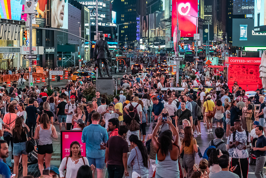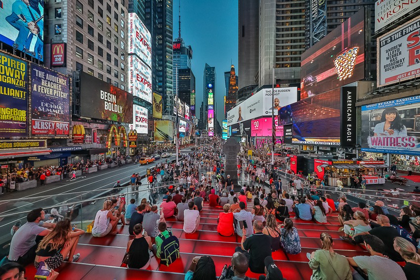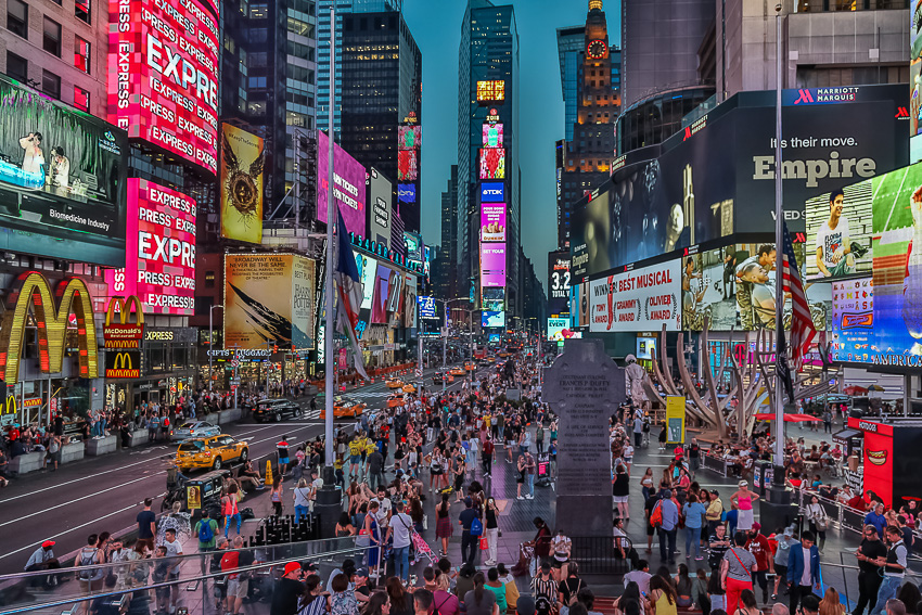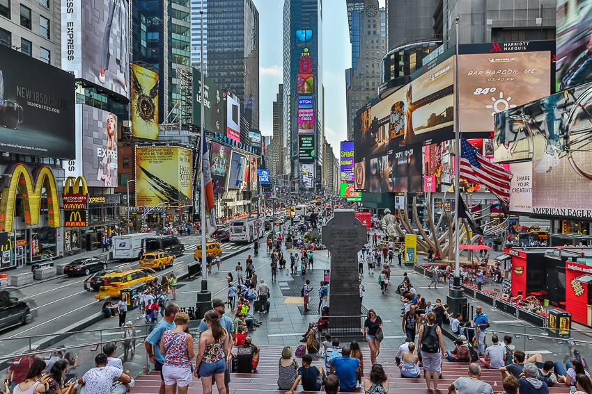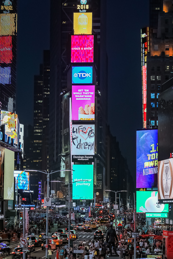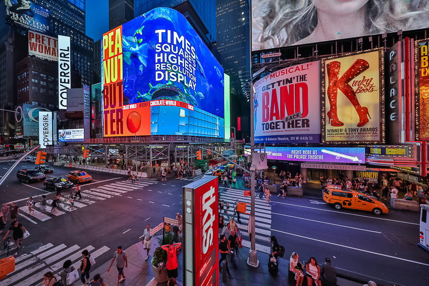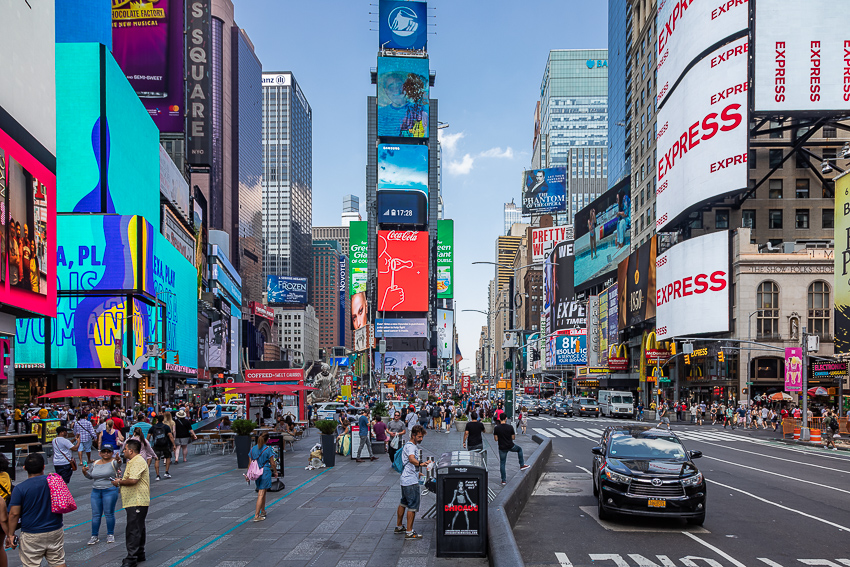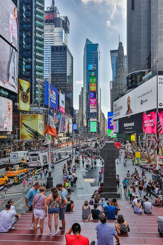 In unserer Unterkunft für die nächsten 6 Tage - dem „Hyatt Centric Times Square New York“ angekommen, konnten wir auch sofort einchecken. Offiziell war der Check- in erst ab 16:00 vorgesehen, so waren wir bereits um kurz nach 13:30 in unserem Zimmer im 38. Stock. Der Ausblick auf die gegenüberliegenden Hochhäuser war faszinierend. Wir richteten uns ein und „chillten“ noch etwas, gegen 15:00 zogen wir dann los. Am nur 100m entfernten „Times Square“ blieb Tom und Paul erst mal die Spucke weg. Wir schlenderten umher und bestaunten die riesigen Werbetafeln und all die „Verrückten“, die hier einfach dazugehören.