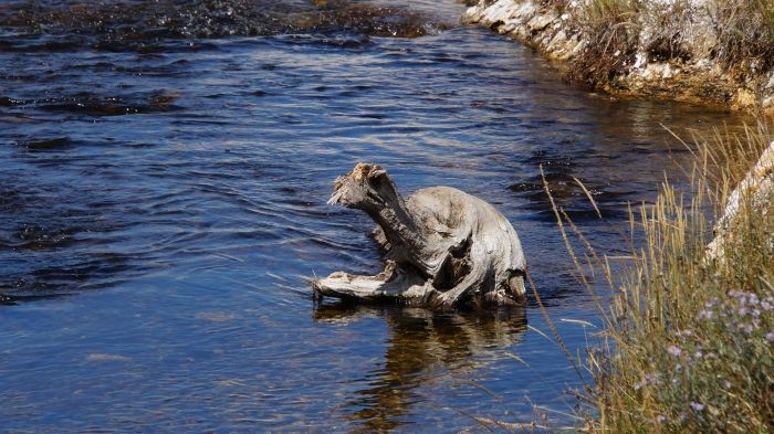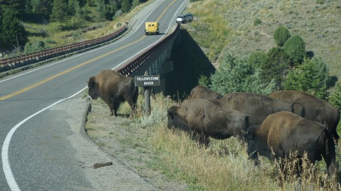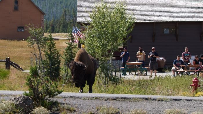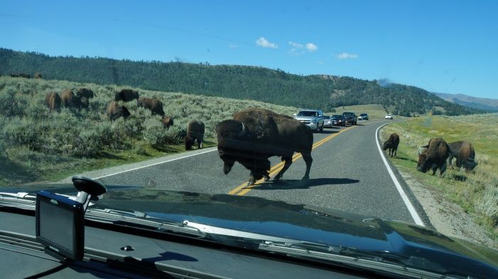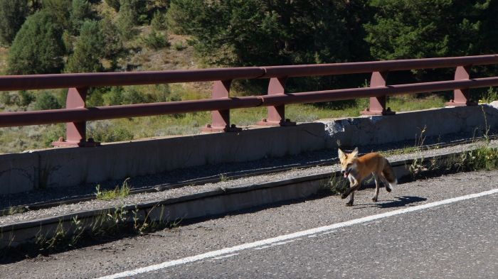 Bei der Überquerung einer Brücke über den Soda Butte Creek kam uns auf der Brücke ein junger Fuchs entgegen - für ihn offenbar der schnellste Weg zum nächsten Futterplatz, ohne sich um die Leute und Autos um sich herum zu kümmern. Faszinierend, so etwas kennt man bei uns einfach nicht!
