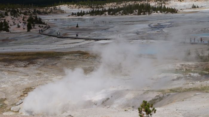 Norris Geyser Basin angekommen sind wir zuerst durch das Porcelain Basin spaziert wo sich neben bunten Pools (Hot Springs) auch schöne, interessante sogenannte Fumeroles (dampfende Löcher in der Erdkruste) befinden.