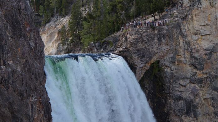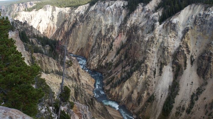 Kurz danach stürzt sich dann am Lower Fall der Yellowstone River hinunter. Die Treppe zum Aussichtpunkt musste ich alleine runter, aber das war mir egal! Beim runter wandern machten mich Wanderer auf ein Tier aufmerksam und tatsächlich stand da nicht weit vom Wegesrand ein Deer und frass ohne sich irgendwie stören zu lassen. Oben an der Treppe stand eine Frau nach Luft ringend und machte uns Mut: if I made it you will make it too! Na, dann mal los.